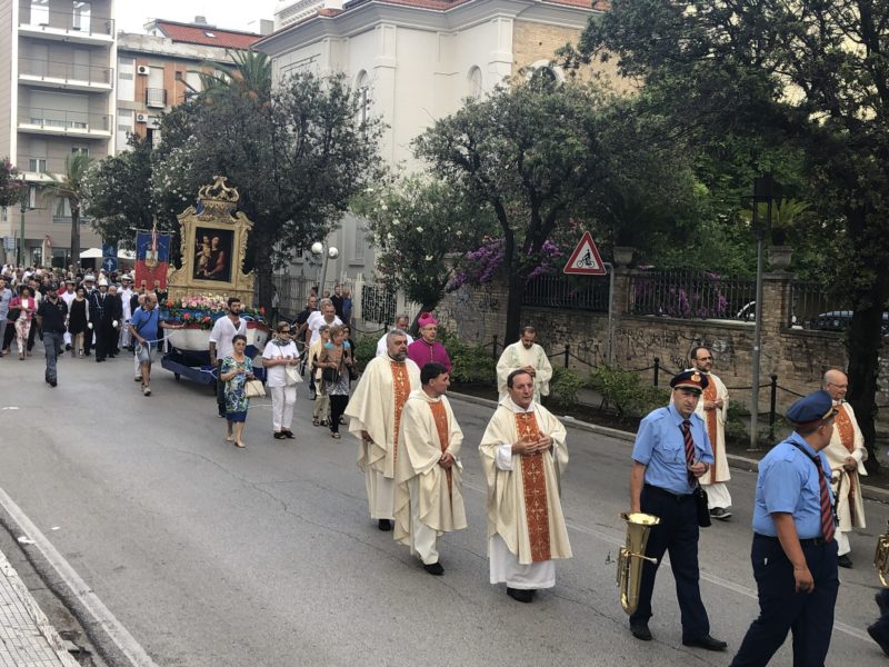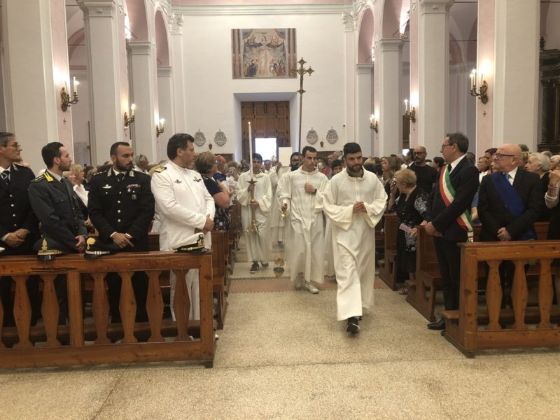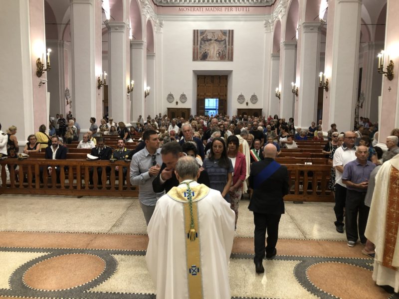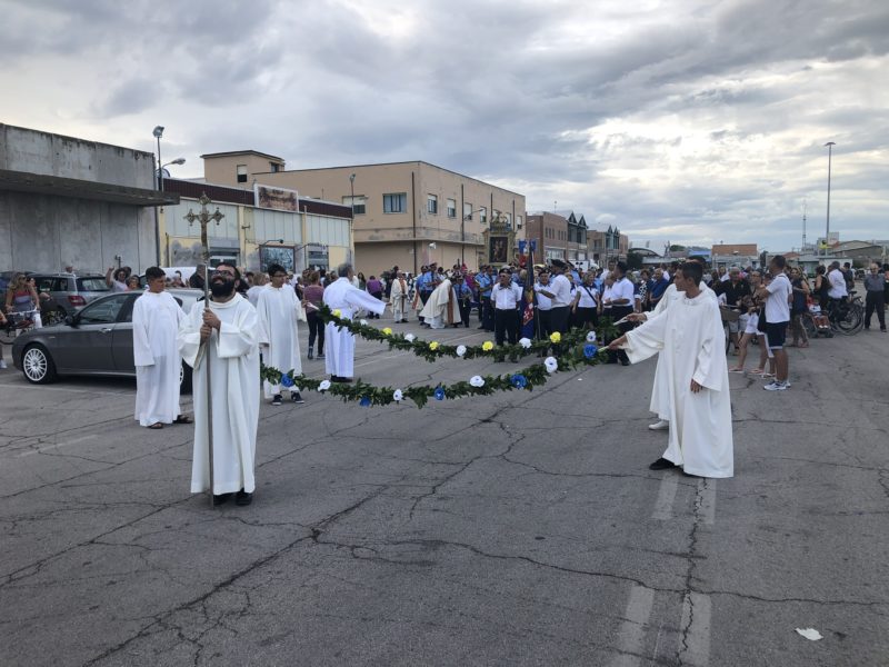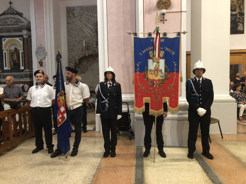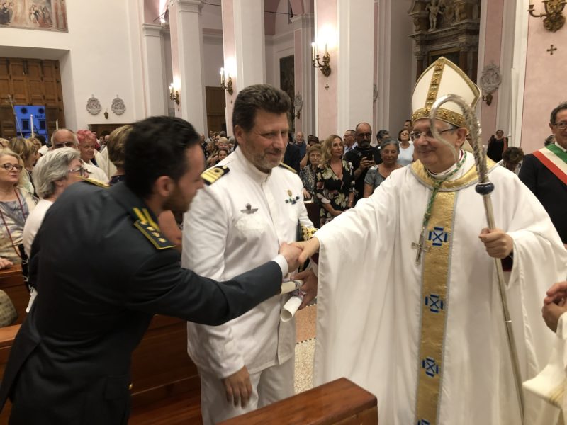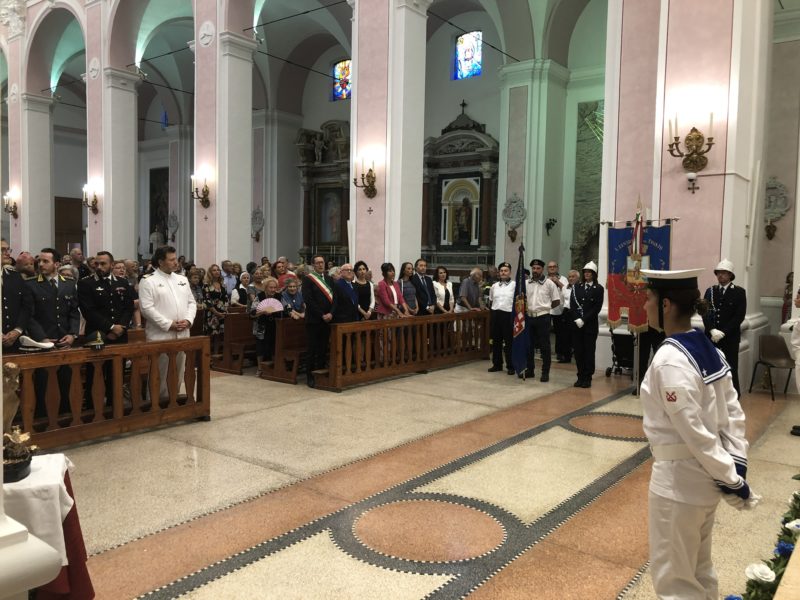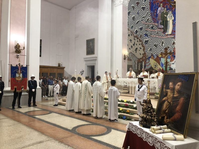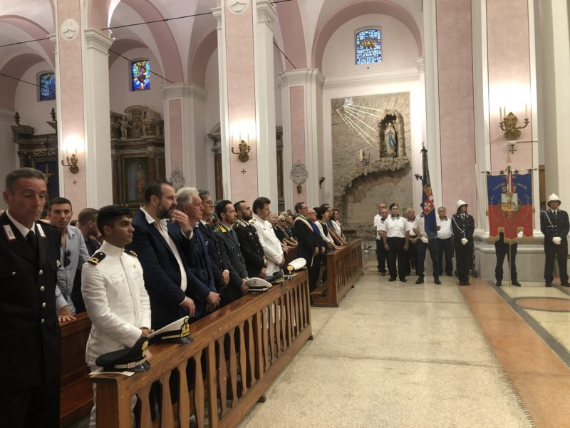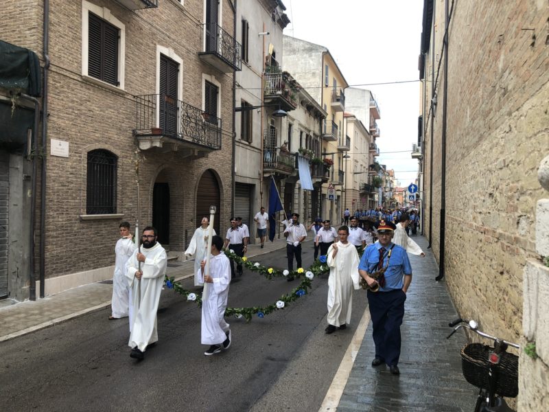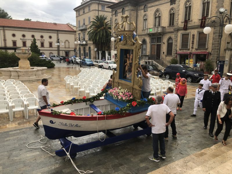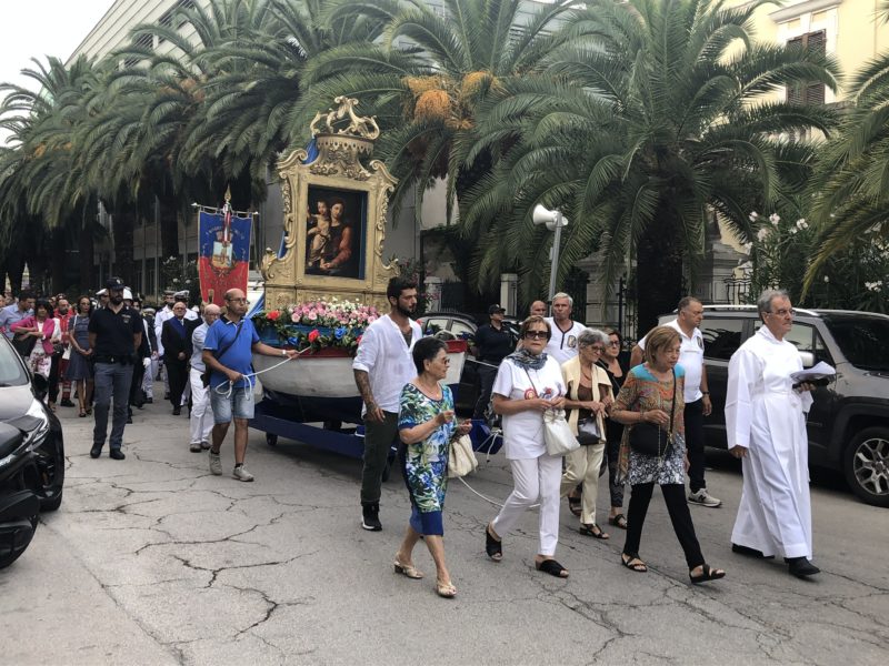 SAN BENEDETTO DEL TRONTO – Domenica 28 luglio con la solenne processione verso la Basilica Cattedrale e la Santa Messa presieduta dal vescovo Carlo Bresciani si è conclusa la festa in onore della Madonna della Marina, Stella del Mare. Il corteo religioso è stato accompagnato dalla Banda Musicale di San Benedetto del Tronto che ha intervallato la recita dei misteri del rosario con brani mariani. Tanti i fedeli, i turisti e i curiosi che si sono fermati lungo le vie Faliero, Colombo, Fiscaletti, Gramsci, Galilei, San Martino e Pizzi al passaggio della venerata immagine della Madonna della Marina, trasportata su uno scafo. A guastare la festa, solo in minima parte per la verità, è stato un modesto rovescio d’acqua che si è riversato sui fedeli e che è iniziato mentre il sacro corteo stava percorrendo via San Martino. Per tale motivo la Santa Messa non è stata celebrata sul sagrato come previsto, ma all’interno della chiesa. Una volta giunti in Cattedrale, ha avuto appunto inizio la Santa Messa, alla quale ha partecipato un gran numero di fedeli, insieme alle autorità civili e militari.