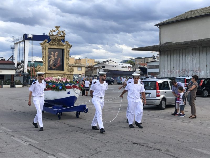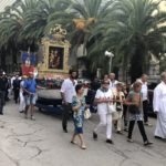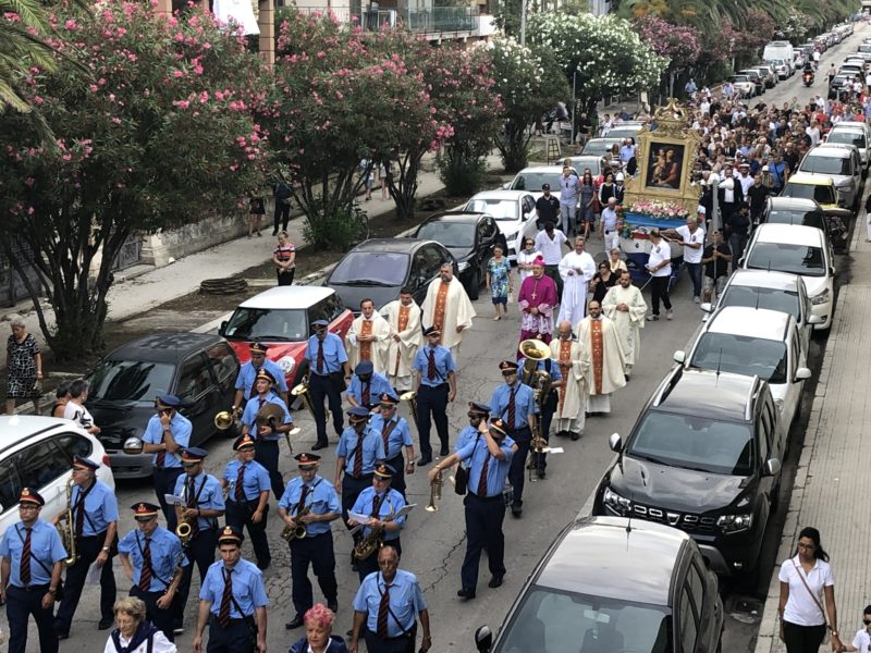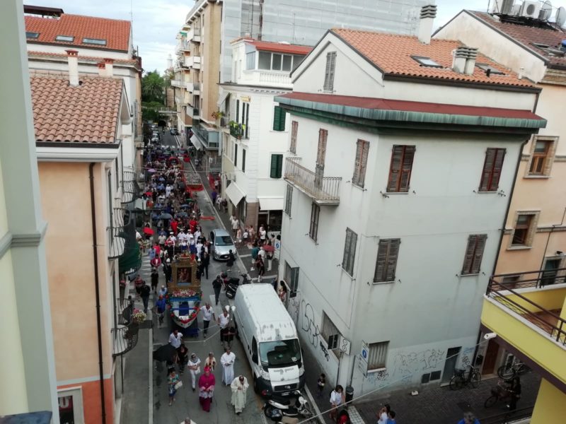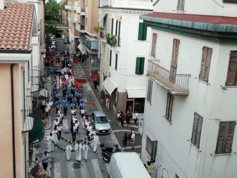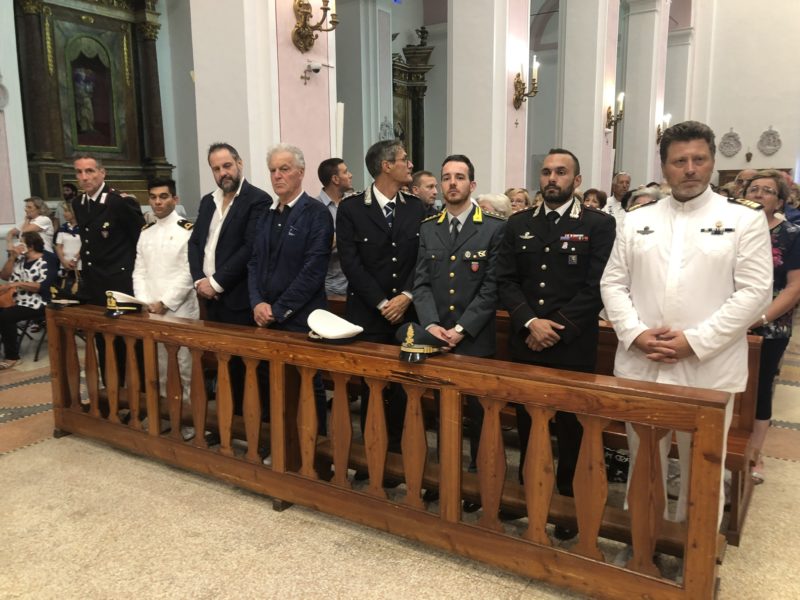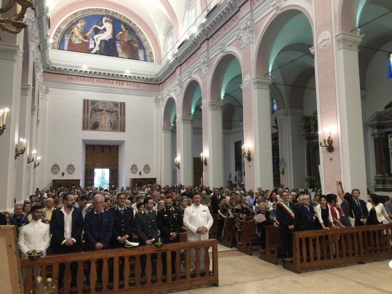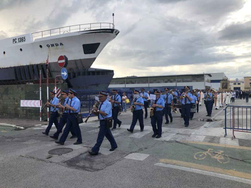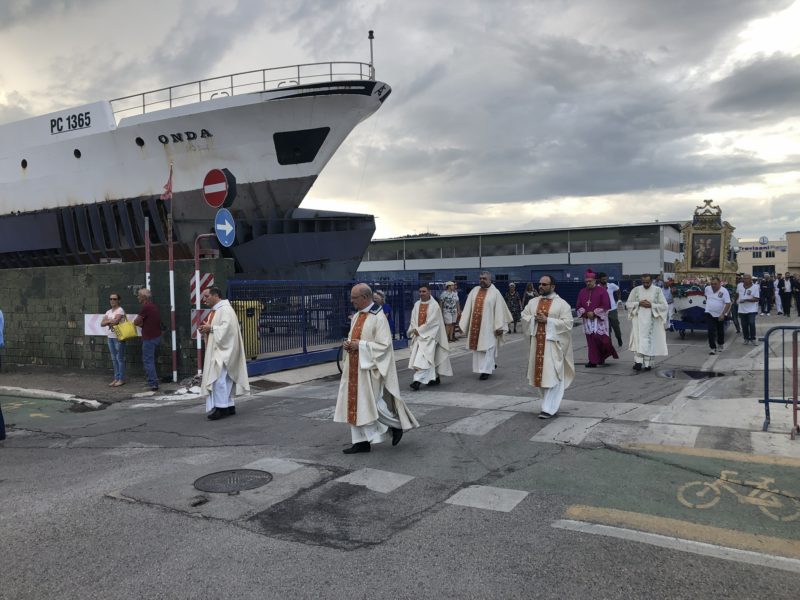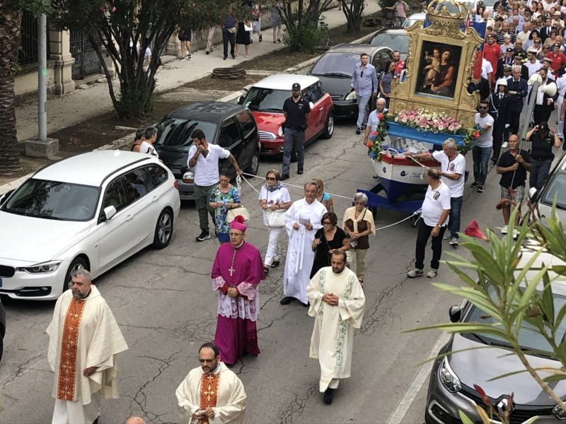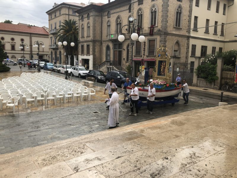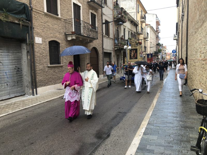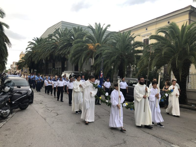SAN BENEDETTO DEL TRONTO – Domenica 28 luglio con la solenne processione verso la Basilica Cattedrale e la Santa Messa presieduta dal vescovo Carlo Bresciani si è conclusa la festa in onore della Madonna della Marina, Stella del Mare. Il corteo religioso è stato accompagnato dalla Banda Musicale di San Benedetto del Tronto che ha intervallato la recita dei misteri del rosario con brani mariani. Tanti i fedeli, i turisti e i curiosi che si sono fermati lungo le vie Faliero, Colombo, Fiscaletti, Gramsci, Galilei, San Martino e Pizzi al passaggio della venerata immagine della Madonna della Marina, trasportata su uno scafo. A guastare la festa, solo in minima parte per la verità, è stato un modesto rovescio d’acqua che si è riversato sui fedeli e che è iniziato mentre il sacro corteo stava percorrendo via San Martino. Per tale motivo la Santa Messa non è stata celebrata sul sagrato come previsto, ma all’interno della chiesa. Una volta giunti in Cattedrale, ha avuto appunto inizio la Santa Messa, alla quale ha partecipato un gran numero di fedeli, insieme alle autorità civili e militari.