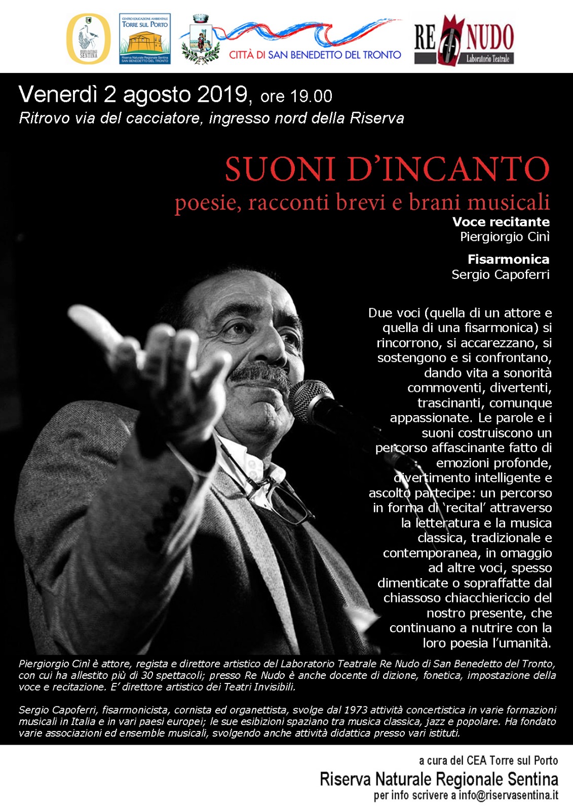 Alle ore 19, con ritrovo presso il pontino di via del Cacciatore, le guide della Riserva accompagneranno i partecipanti alla spiaggia antistante la Torre sul Porto dove, alle ore 19.30, si terrà lo spettacolo dal titolo “SUONI D’INCANTO, poesie, racconti brevi e brani musicali”.