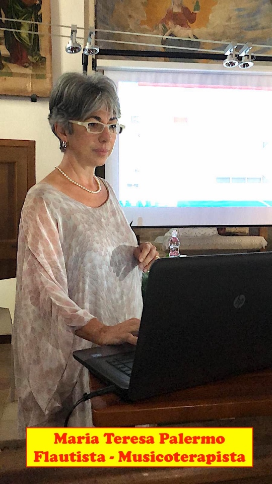 – Maria Teresa Palermo, flautista (per venti anni ha fatto parte dell’Orchestra dell’Accademia Nazionale di Santa Cecilia) e musicoterapista. Dopo diverse esperienze in ospedale, si occupa delle applicazioni cliniche della musica con gli adulti in ambito oncologico e nelle cure palliative.