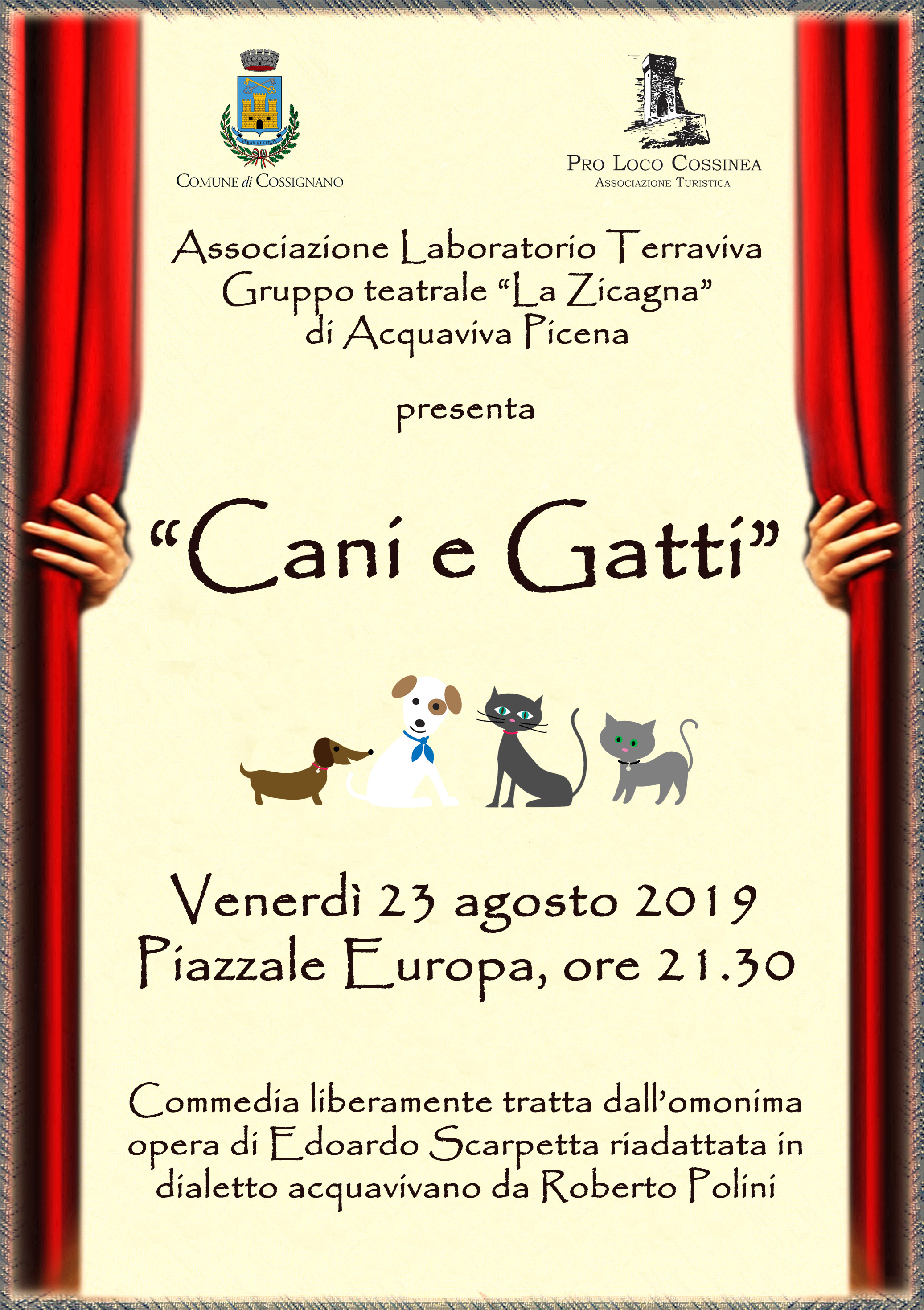 La commedia dialettale “Cani e Gatti” porta in scena le vicende di due anziani genitori che, per evitare la separazione della figlia dal marito, fingono una vita matrimoniale litigiosa nell’intento di far comprendere ai giovani la dura realtà quotidiana e l’agognato raggiungimento della pace familiare.