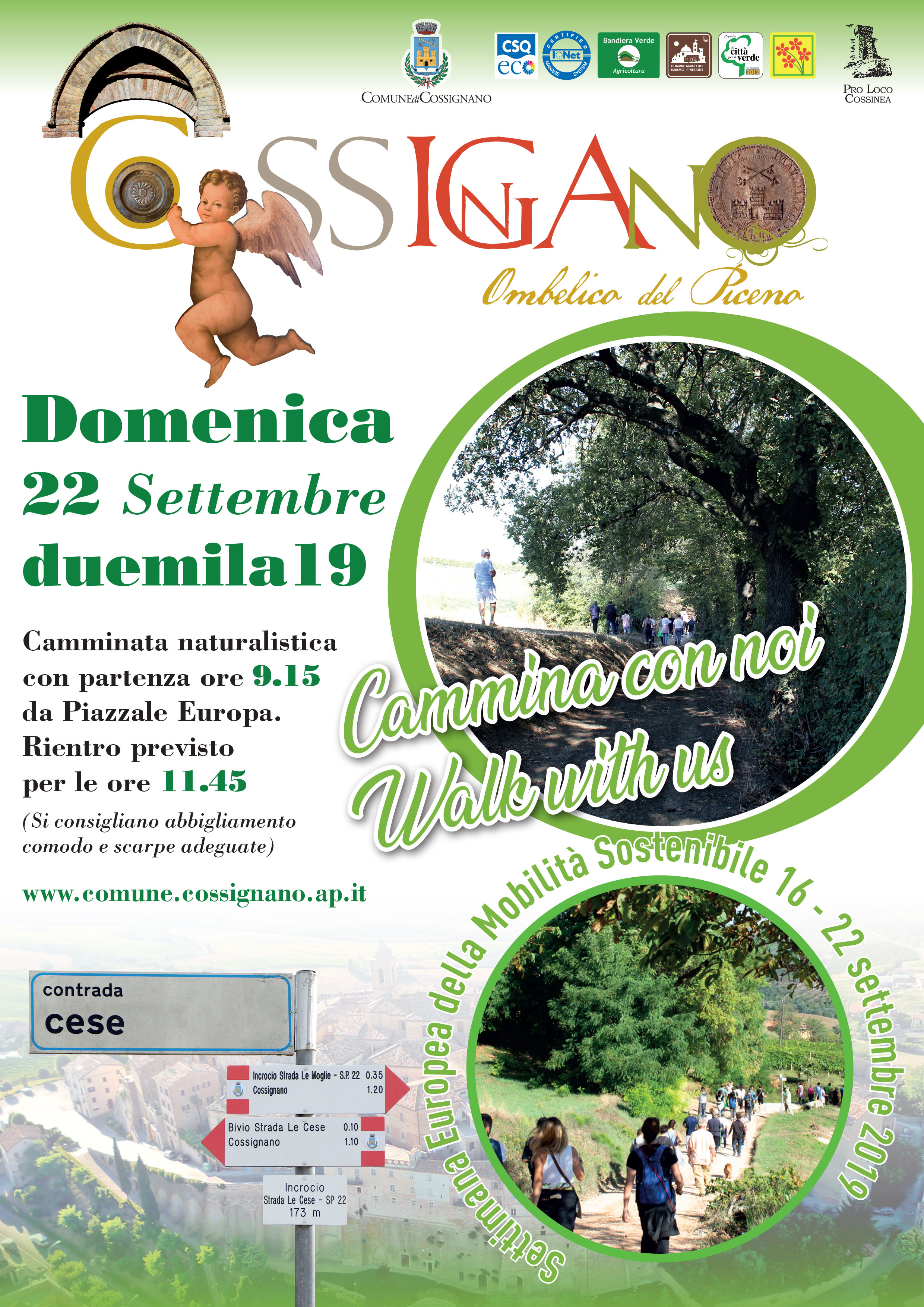 Domenica 22 settembre 2019, alle ore 9.15, con raduno al Piazzale Europa, è organizzata una camminata naturalistica a partecipazione gratuita di circa 6 km alla scoperta del territorio di Cossignano.