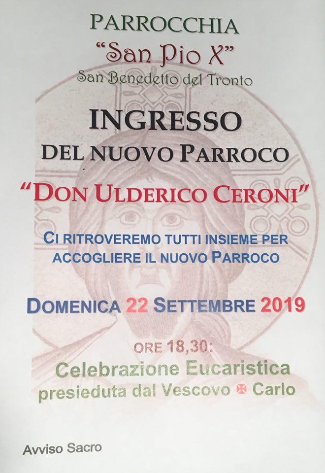 DIOCESI – Si terrà oggi pomeriggio, domenica 22 settembre, alle ore 18.00 presso la Parrocchia San Pio X, la celebrazione Eucaristica per l’ingresso del nuovo parroco, don Ulderico Ceroni. La santa Messa sarà presieduta dal Vescovo della diocesi di San Benedetto del Tronto – Ripatransone – Montalto, Mons. Carlo Bresciani.