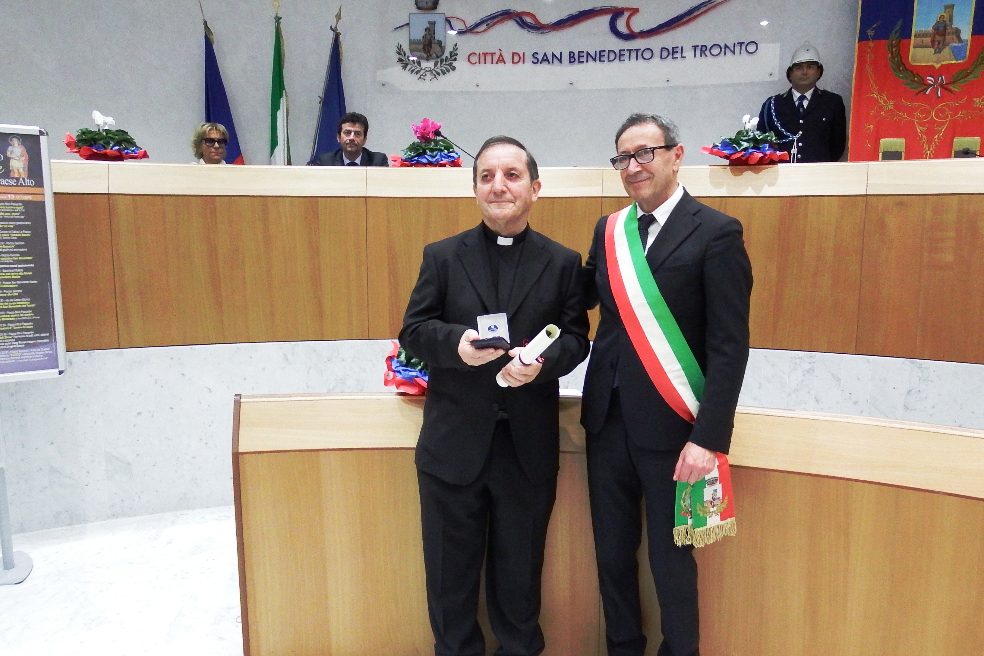 SAN BENEDETTO DEL TRONTO – «Siamo tutti chiamati affinché l’uomo viva pienamente in Anima, Corpo e Spirito. L’augurio, dunque, è di andare avanti con questa sinergia tra la realtà civile e quella religiosa». Lo ha detto il reverendo Giancarlo Breda, Padre Superiore dei Sacramentini di San Benedetto, ricevendo dalle mani del sindaco l’onorificenza Gran Pavese Rossoblù, nel corso di una cerimonia ufficiale svoltasi sabato mattina in municipio.