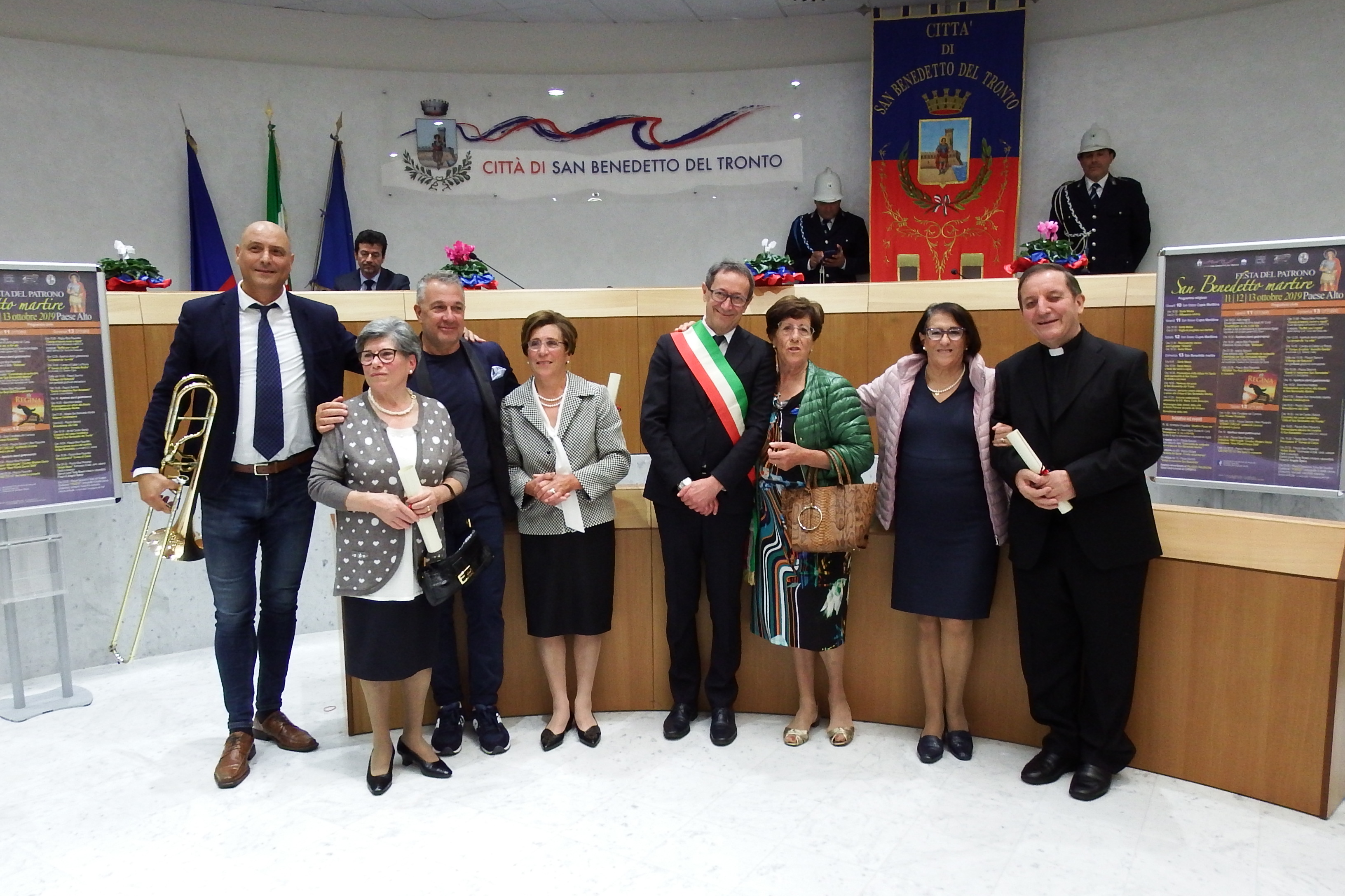 Tornando al Gran Pavese, insieme a quella rivolta ai Padri Sacramentini ci sono state altre 3 benemerenze: al giornalista Remo Croci “per la capacità di raccontare le storie di questo Paese con precisione ma anche con partecipazione umana, al musicista Lito Fontana “per la luminosa carriera artistica costruita su una meticolosa ed appassionata dedizione allo studio e alla promozione della musica”, alle sorelle Anna Maria, Elsa, Giuseppina, Ombretta e Dina Merlini (quest’ultima assente alla premiazione) “per incarnare una splendida storia di imprenditoria femminile” nel campo del commercio del pesce”. La cerimonia ha visto la partecipazione di una delegazione ufficiale proveniente da Viareggio (città gemellata con S. Benedetto) ed è stata intermezzata da momenti musicali curati dal premiato trombonista Fontana, accompagnato al pianoforte da Alberto Rossi.