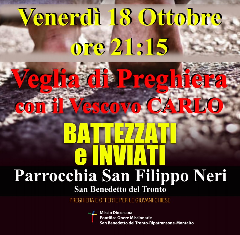 DIOCESI – Venerdì 18 Ottobre alle ore 21:15, si terrà una Veglia Missionaria diocesana, presso la Chiesa di San Filippo Neri di San Benedetto del Tronto. La celebrazione sarà presieduta dal Vescovo Carlo Bresciani.