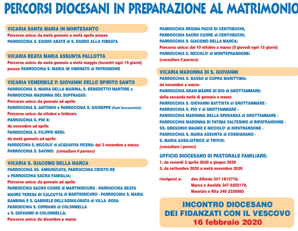 DIOCESI – Anche quest’anno la Diocesi offre a tutti i fidanzati la possibilità di conoscere i percorsi in preparazione al matrimonio che si svolgeranno nell’anno pastorale 2019/20 nelle comunità parrocchiali attraverso la locandina che è presente in tutte le parrocchie.