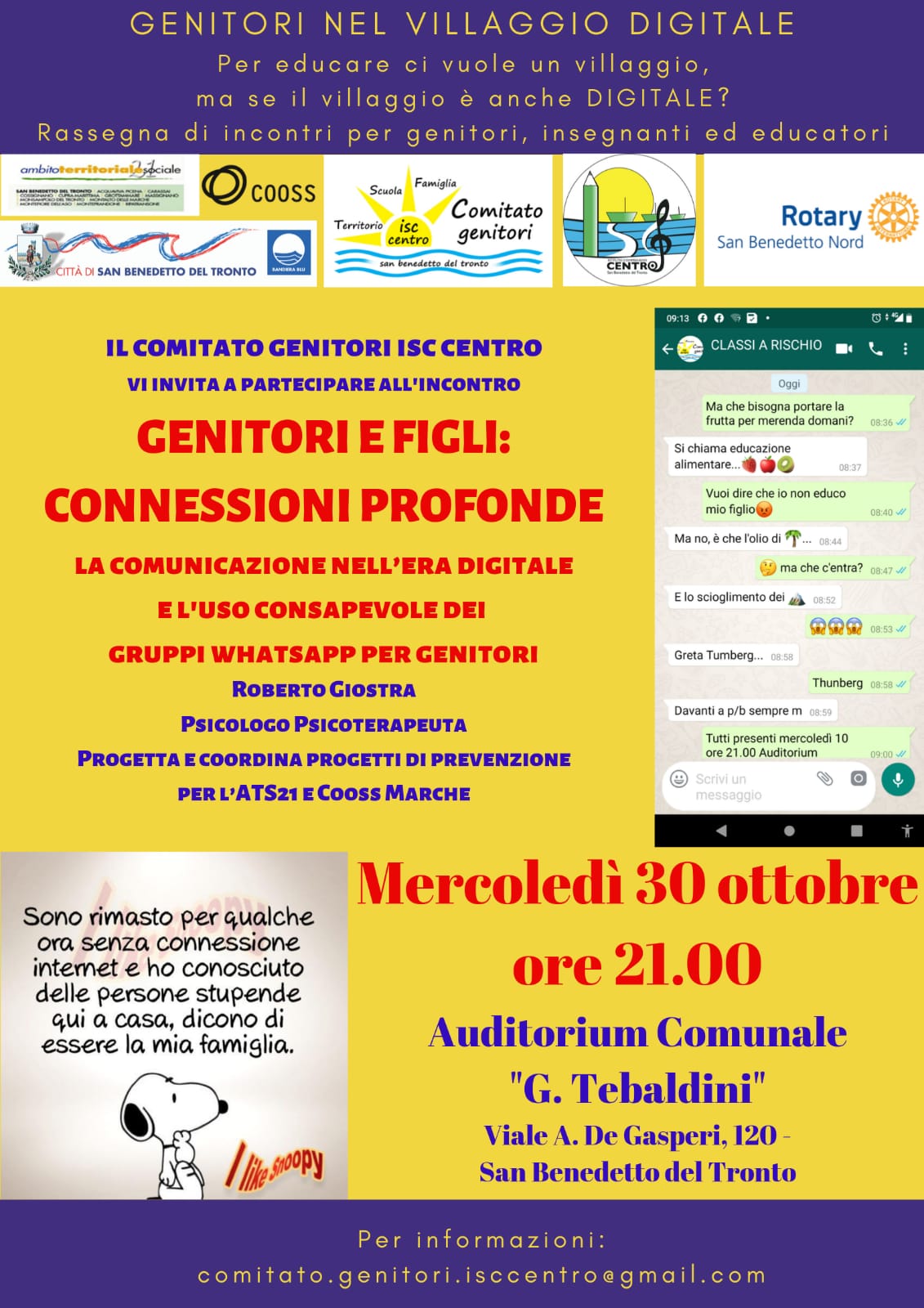 Per questo motivo il Comitato genitori ISC Centro di San Benedetto del Tronto ha organizzato un appuntamento dal titolo “Genitori e figli, connessioni profonde” che si terrà mercoledì 30 ottobre alle ore 21 presso l’auditorium comunale. Interverrà la psicologa Roberta Giostra.