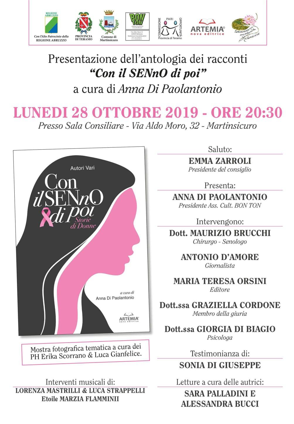 MARTINSICURO  Lunedì 28 ottobre, a partire dalle ore 20:30 presso la Sala Consiliare del Comune di Martinsicuro si svolgerà la presentazione dell’antologia di racconti “Con il SENnO di poi – Storie di Donne”, a cura di Anna Di Paolantonio, che riunisce racconti di autori vari. L’evento è stato realizzato dalla locale Commissione Pari Opportunità con l’alto patrocinio della Regione Abruzzo, della Provincia di Teramo, del Comune di Martinsicuro e della Cpo provinciale in collaborazione con l’Associazione “Bon Ton” e con l’Artemia Nova Editrice.