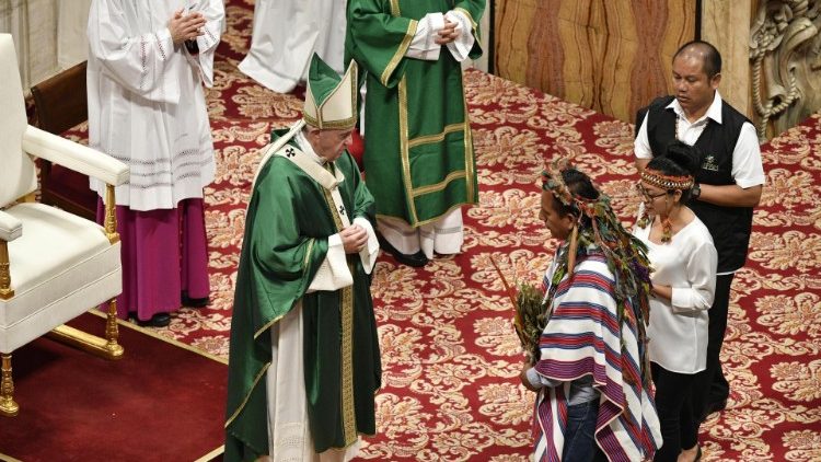 La processione iniziale è aperta da un’uditrice indigena, che porta un vaso con terra e piantine dell’Amazzonia, che poi porterà all’altare all’offertorio, e da uditori, esperti e invitati laici e religiosi non sacerdoti, e chiusa dal Papa che utilizza il pastorale donato dai partecipanti al Sinodo. Nell’omelia Francesco evidenzia, nella Parola del giorno, le preghiere di tre personaggi: il fariseo e il pubblicano nella parabola di Gesù del Vangelo, il povero nella prima Lettura.
