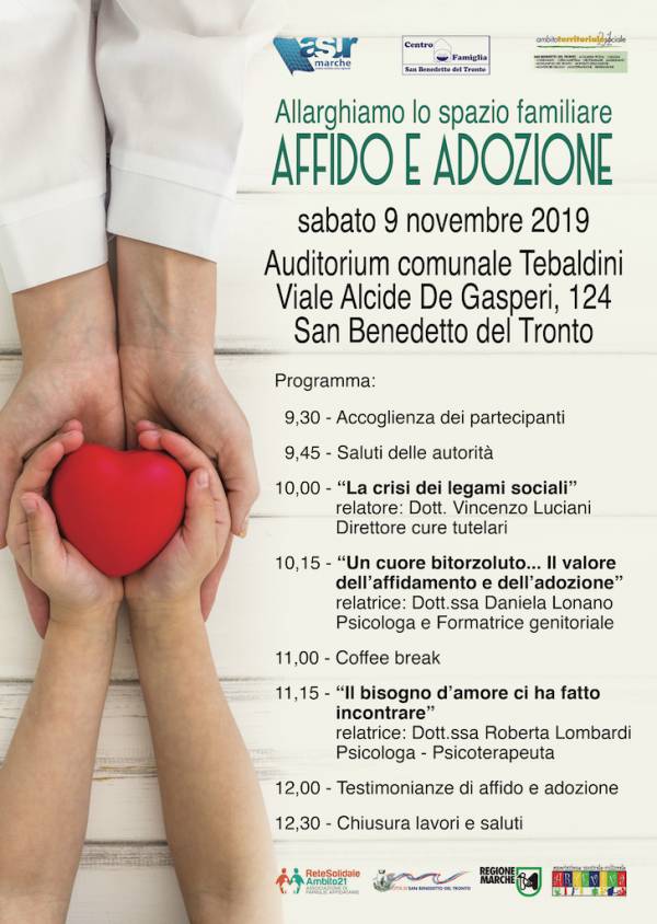 SAN BENEDETTO DEL TRONTO – Sabato 9 Novembre alle ore 9,30, si svolgerà l’incontro: “Affido e adozione: allarghiamo lo spazio familiare” presso l’Auditorium comunale Tebaldini, Viale Alcide De Gasperi, 124 a San Benedetto del Tronto.