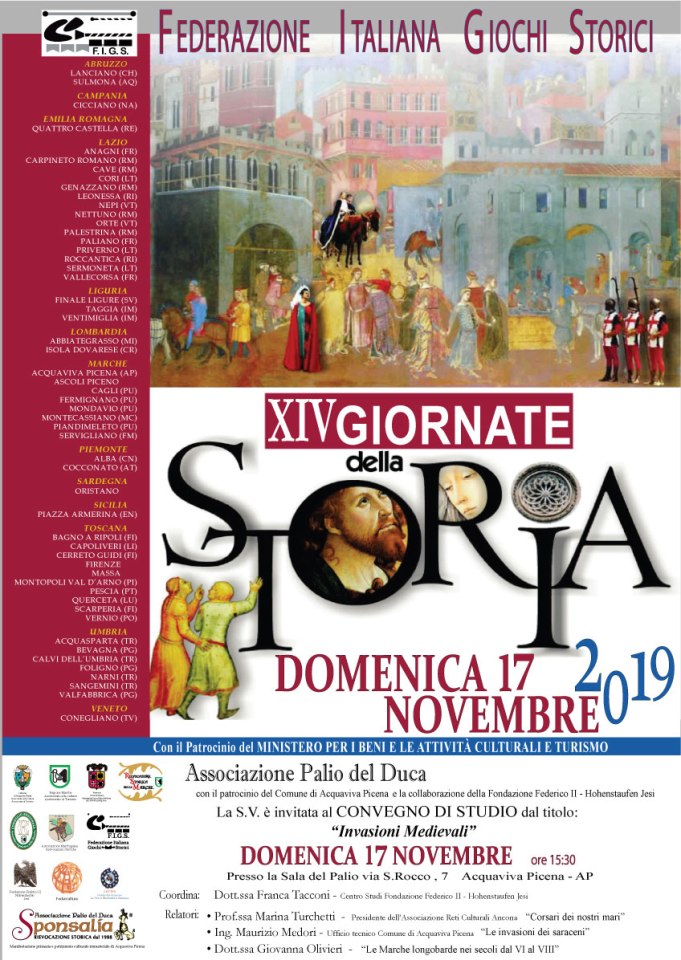 ACQUAVIVA PICENA – L’Associazione Palio del Duca, del cav. Nello Gaetani, di Acquaviva Picena in collaborazione con la Fondazione Federico II-Hohenstaufen di Jesi, in occasione delle XIV Giornate della Storia 16 – 17 novembre 2019 promosse dalla federazione Italiana Giochi Storici, organizza il convegno di studio dal titolo “Invasioni medievali” presso la sede dell’associazione stessa sita presso la Sala del Palio in via san Rocco n. 7 ad Acquaviva Picena, domenica 17 novembre alle ore 15:30.