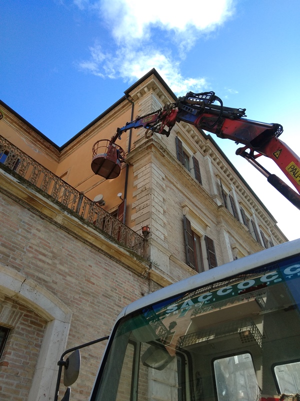 – ispezione a vista di tutti i cornicioni, cornici e aggetti dell’edificio comunale mediante l’utilizzo di gru con cestello;