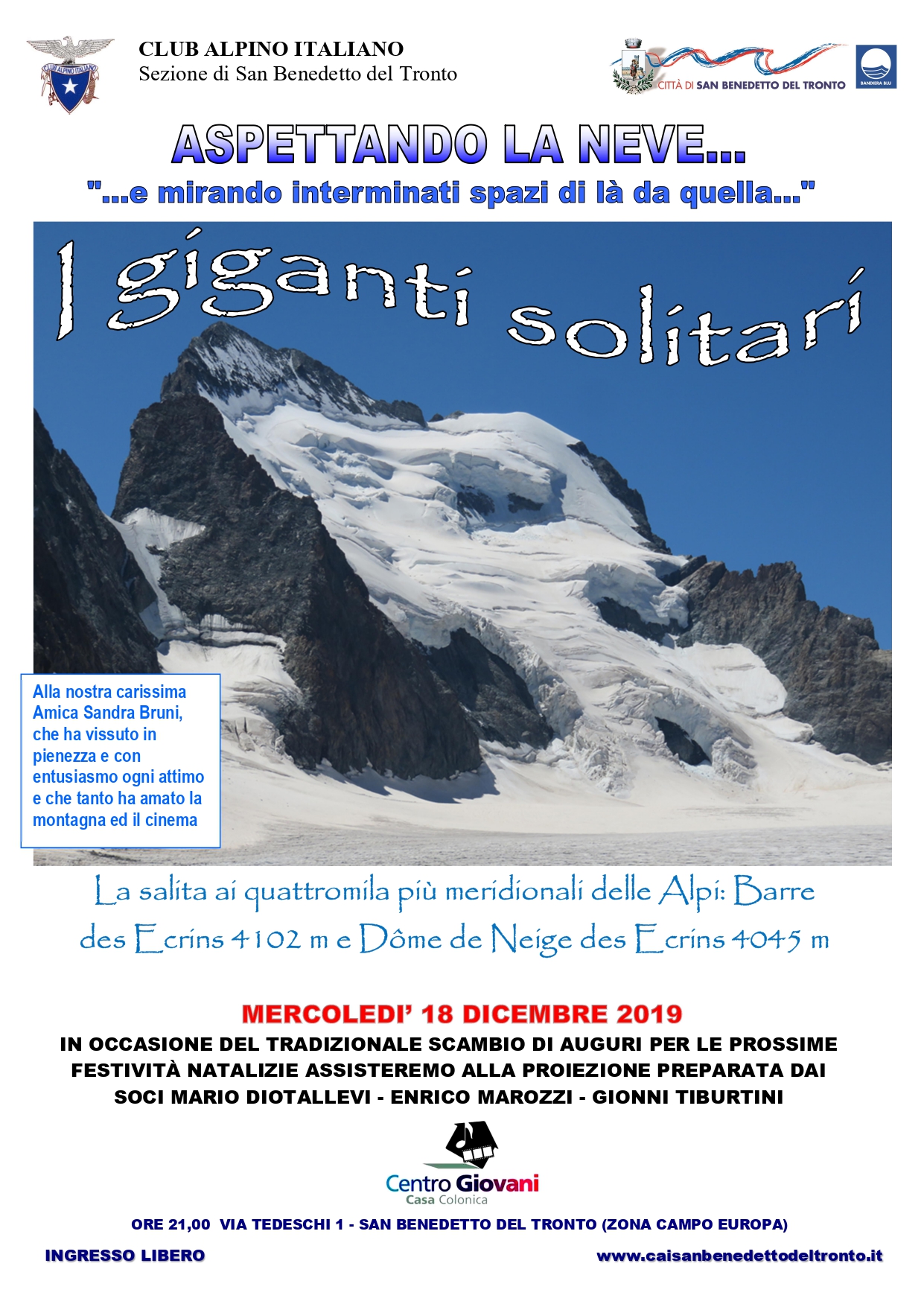 In occasione del tradizionale scambio di auguri per le prossime festività natalizie, assisteremo alla proiezione preparata dai soci CAI Mario Diotallevi – Enrico Marozzi – Gionni Tiburtini dal titolo “I GIGANTI SOLITARI”: la salita ai quattromila più meridionali delle Alpi: Barre des Ecrins 4102 m e Dôme de Neige des Ecrins 4045 m.