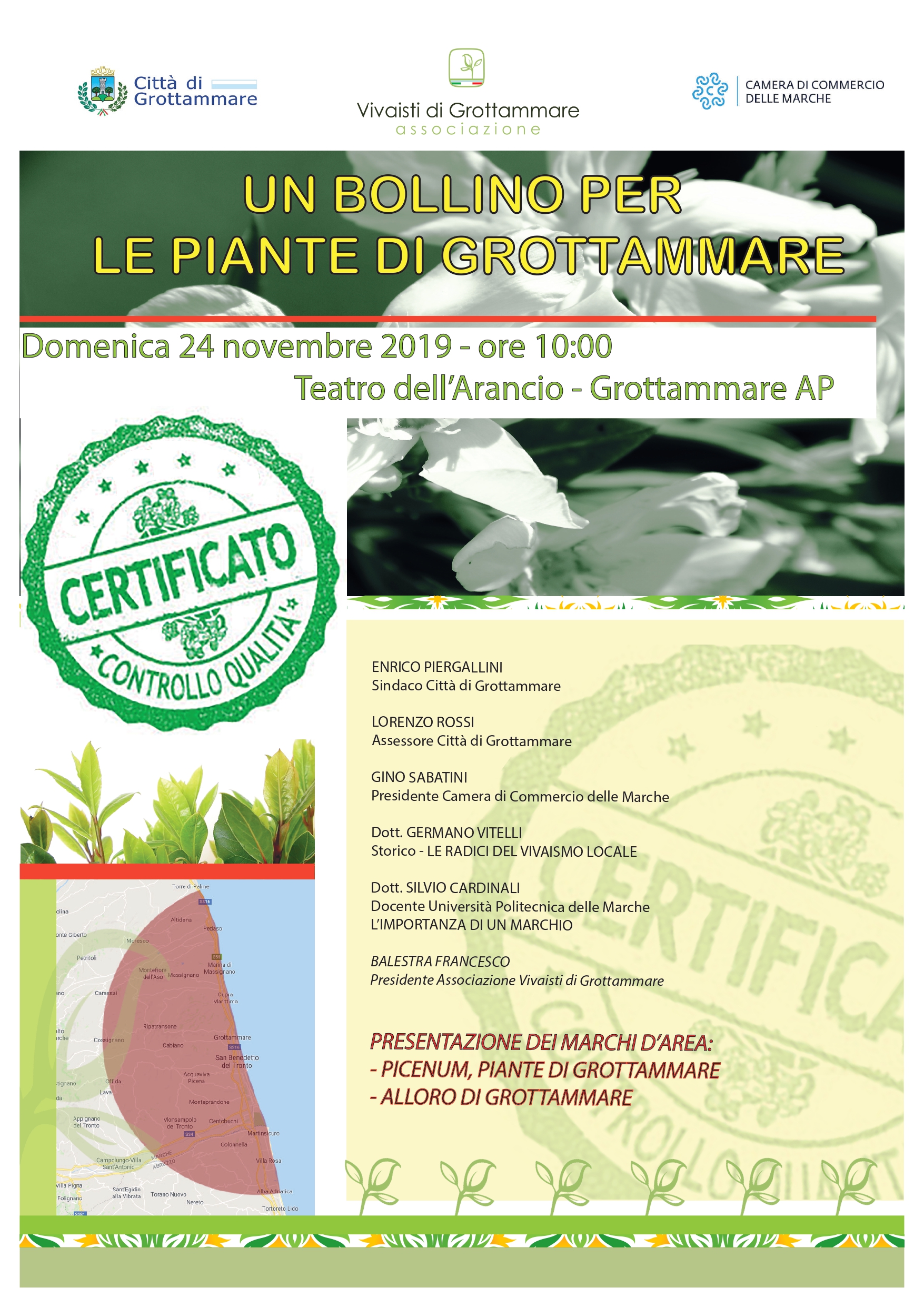 GROTTAMMARE – “Un bollino per le piante di Grottammare”. Questo il titolo del convegno in programma domenica 24 novembre, alle ore 10.00 al teatro dell’Arancio di Grottammare alta. Organizzato dall’Associazione Vivaisti di Grottammare in collaborazione con la Città di Grottammare e con la Camera di Commercio delle Marche, l’appuntamento vuole fare il punto sui nuovi marchi che attestano la qualità della produzione vivaistica picena. Lo scorso 18 giugno il Ministero dello Sviluppo economico ha accolto la domanda, presentata nel dicembre 2018 presso la Camera di Commercio delle Marche dall’associazione Vivaisti di Grottammare, per il riconoscimento di due “marchi d’area” alle produzione vivaistiche del nostro territorio. In particolare, uno dei due marchi è specifico per l’”Alloro di Grottammare”, pianta leader dei vivai grottammaresi e piceni e candidata per il riconoscimento europeo di qualità (IGP o DOP), mentre l’altro, denominato “Picenum – Piante di Grottammare” copre tutte le altre piante prodotte in un ‘area che si estende formando un ipotetico rettangolo da San Benedetto del Tronto a Pedaso lungo la costa, e da Moresco a Castel di Lama, come estremi interni, passando per il cuore delle produzioni che è Grottammare.