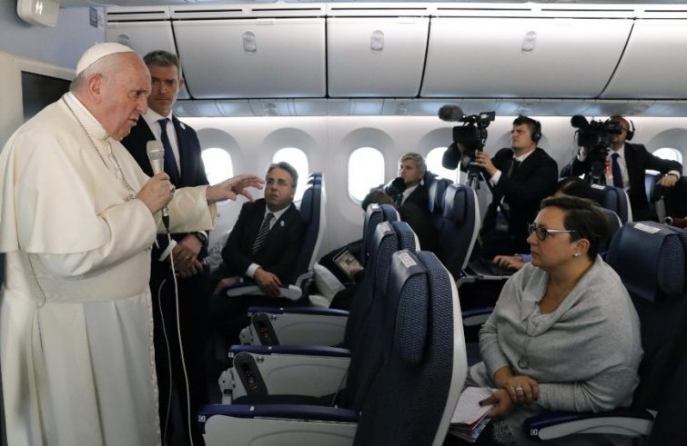 Approfitto della sua domanda per aggiungere che avete parlato poco della Thailandia, che è un’altra cosa differente dal Giappone, una cultura della trascendenza, una cultura anche della bellezza diversa dalla bellezza del Giappone: una cultura, tanta povertà e tante ricchezze spirituali. Ma anche c’è un problema che fa male al cuore che ci fa pensare a “Grecia e le altre”, lei è una maestra in questo problema dello sfruttamento, lei lo ha studiato bene, e il suo libro ha fatto tanto bene. E la Thailandia, alcuni posti della Thailandia sono difficili per questo. Ma c’è la Thailandia del sud, e anche c’è la bella Thailandia del nord, dove non sono potuto andare, che è tribale e ha tutta un’altra cultura. Ho ricevuto una ventina di persone di quella zona, cristiani primi, primi battezzati, che sono venuti a Roma, con un’altra cultura diversa, quelle culture tribali. E Bangkok, abbiamo visto, è una città forte, modernissima, ma ha dei problemi diversi da quelli del Giappone e ha ricchezze diverse da quelle del Giappone. Sul problema dello sfruttamento ho voluto sottolinearlo per ringraziare lei per il suo libro, come anche vorrei ringraziare il libro “verde” di Franca Giansoldati: due donne che vengono sull’aereo che hanno fatto un libro ognuno dei quali tocca dei problemi di oggi, il problema ecologico e il problema della distruzione della madre terra, dell’ambiente, e il problema dello sfruttamento umano che lei ha toccato. Si vede che le donne lavorano più degli uomini e sono capaci. Grazie a voi, ambedue per questo contributo. E ancora non dimentico la camicia di Rocio (il riferimento è alla camicia di una donna messicana assassinata che Valentina Alazraki aveva donato al Papa durante un’intervista video nei mesi scorsi, ndr). E grazie per fare delle domande dirette, questo fa bene. Pregate per me. Buon pranzo.
