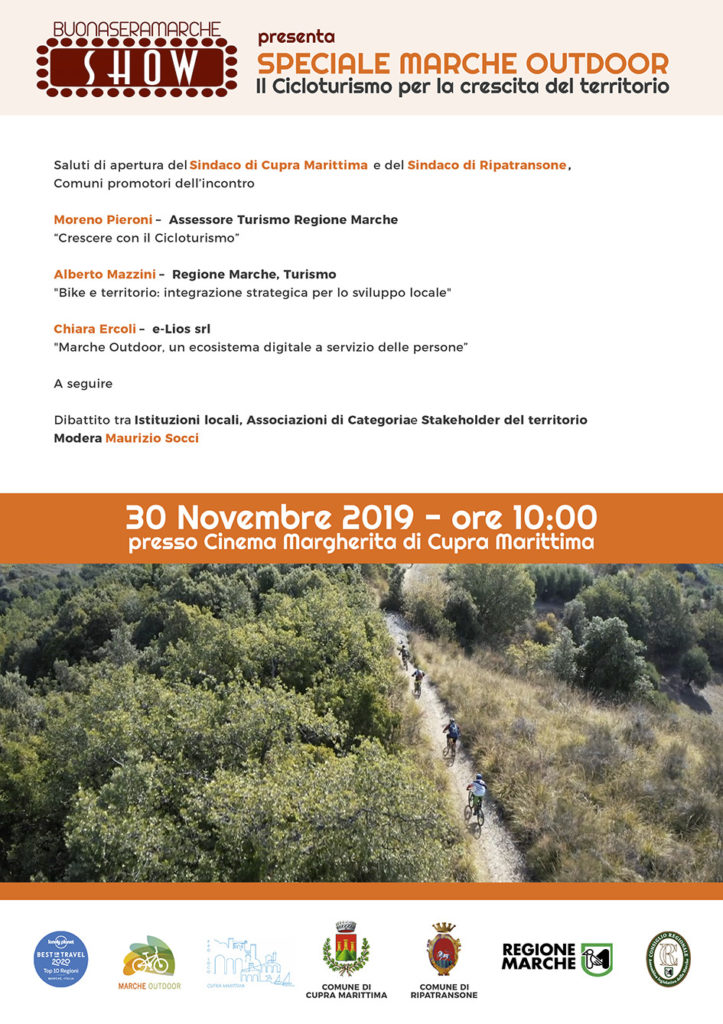 CUPRA MARITTIMA – Si terrà al Cinema Margherita di Cupra Marittima, Sabato 30 Novembre alle ore 10.00, l’incontro pubblico dal titolo Il Cicloturismo per la Crescita del Territorio, evento divulgativo promosso dai Comuni di Cupra Marittima e Ripatransone che ha l’obiettivo di presentare il Programma Regionale Marche Outdoor agli stakeholder istituzionali e privati del Sud delle Marche.