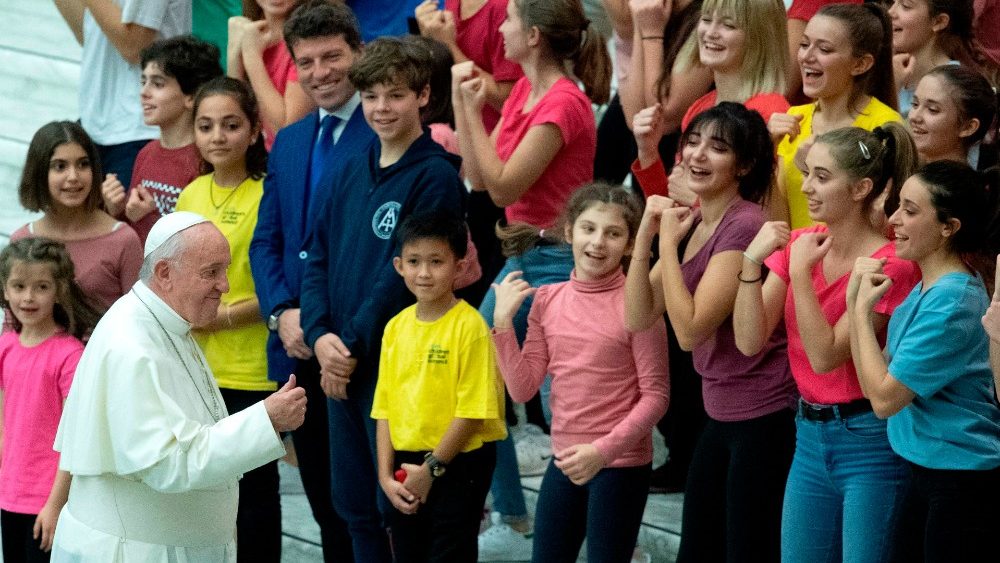 Il clima tra i ragazzi è di grande gioia e il loro entusiasmo si scatena all’ingresso del Papa. Apre l’udienza il saluto della presidente nazionale della Fidae Virginia Kaladich, e quello di un giovane. Seguono i passi di danza, che esprimono armonia, di un altro ragazzo e la consegna al Papa di un dono: una trapunta composta da 43 quadrati uniti insieme, che rappresentano le nazioni da cui provengono i partecipanti al progetto.