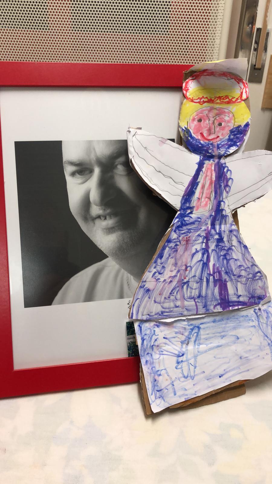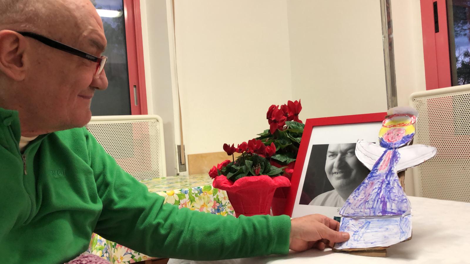 Infine Denni, l’altro suo grande amico e compagno di una vita qui vissuta insieme e anche lui dalla sua sedia a rotelle, dopo un’assidua partecipazione alla messa a voce altisonante e con un’incredibile capacità canora, ci spiegava di aver voluto salutare “Mimo” dedicandogli quell’angelo da lui disegnato che era appoggiato alla foto piazzata sull’altare.