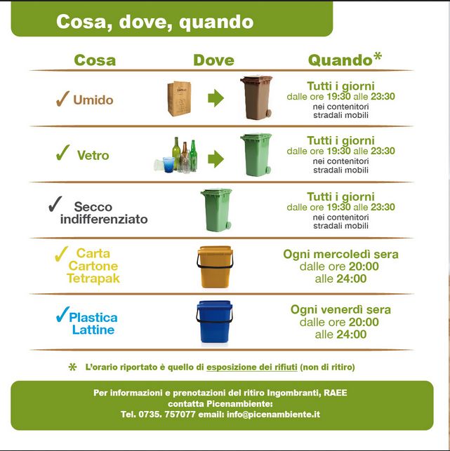 Si ricorda infine che per gli operatori commerciali (bar, ristoranti, pizzerie, gelaterie, negozi, supermarket, ortofrutta, ecc.) e per condomìni contattati sono stati attivati ulteriori servizi personalizzati di raccolta domiciliare. In ogni caso è sempre possibile rivolgersi per ogni ulteriore informazione all’Ecosportello di Picenambiente, aperto tutte le mattine di lunedì, mercoledì, venerdì e sabato al pian terreno del Municipio di viale De Gasperi e il giovedì mattina nella delegazione comunale di Porto d’Ascoli.