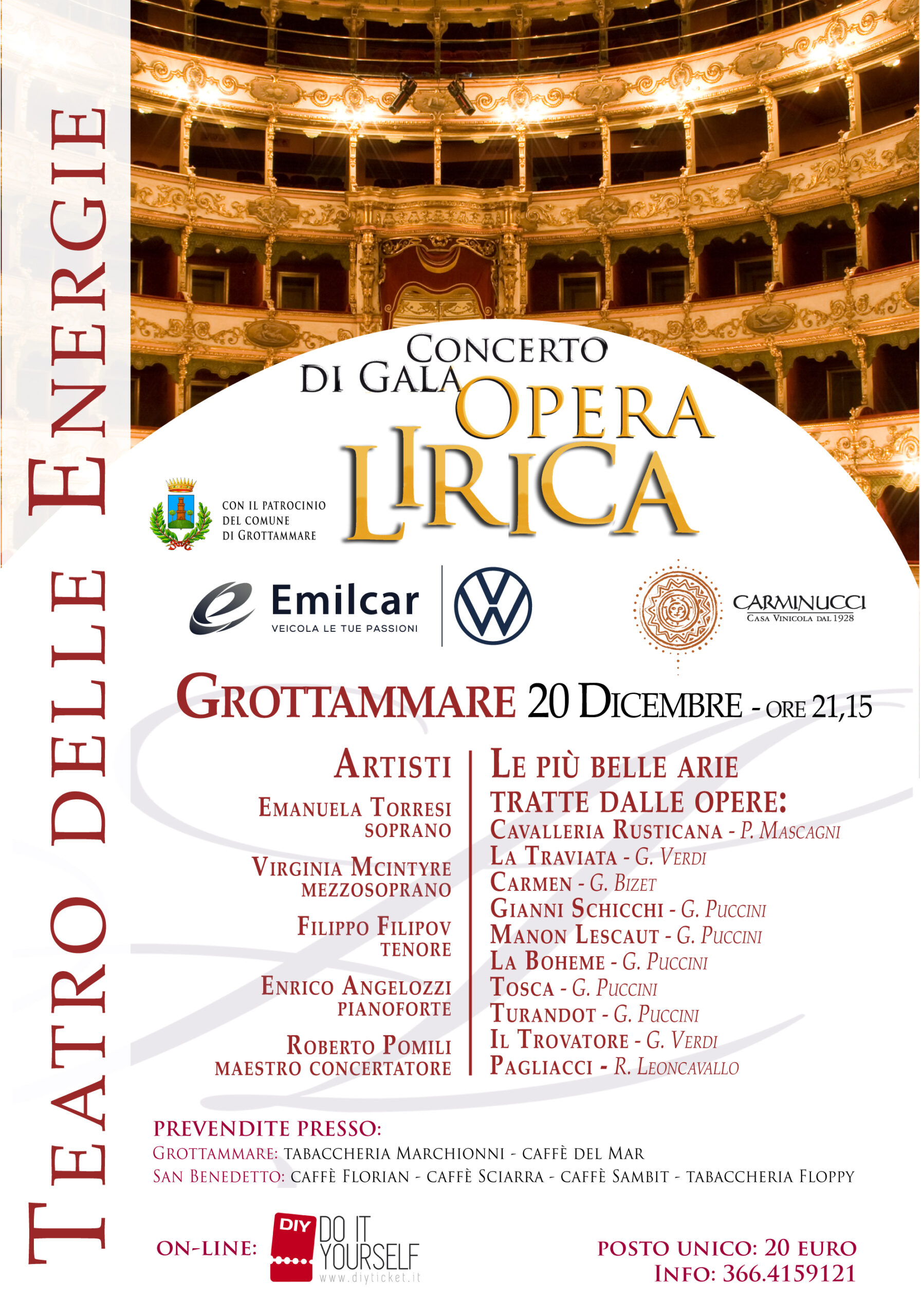 GROTTAMMARE – La Stagione concertistica 2019 del Teatro delle Energie di Grottammare si chiude, venerdì 20 dicembre alle 21.15 torna il concerto di gala dell’opera lirica in collaborazione con la Concessionaria Emilcar e con la Vinicola del Tesino Carminucci.