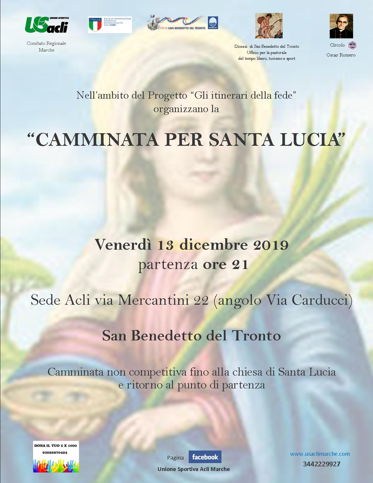 SAN BENEDETTO DEL TRONTO – In occasione di una festività tanto caro ai cittadini sambenedettesi, venerdì 13 dicembre si svolgerà la “Camminata per Santa Lucia”. Si tratta di una iniziativa realizzata da Circolo Acli Oscar Romero e Unione Sportiva Acli Marche, con la collaborazione dell’Ufficio per la pastorale tempo libero, turismo e sport della diocesi di San Benedetto del Tronto e dell’amministrazione comunale di San Benedetto del Tronto. Nel corso dell’anno 2019 sono state tante le chiese, i conventi e le altre strutture religiose che sono state visitate a Spinetoli, Monteprandone, San Benedetto ed Ascoli abbinando così la conoscenza del territorio alla promozione dell’attività fisica. Il programma della manifestazione prevede il ritrovo dei podisti davanti alla sede Acli di San Benedetto del Tronto (via Mercantini, angolo Via Carducci) ed una camminata, aperta a cittadini di ogni età, fino alla chiesa di Santa Lucia per poi far ritorno sul luogo di partenza. La partecipazione è gratuita. Per ulteriori informazioni sul progetto “Gli itinerari della fede” si possono consultare il sito www.usaclimarche.com o la pagina facebook Unione Sportiva Acli Marche.