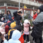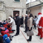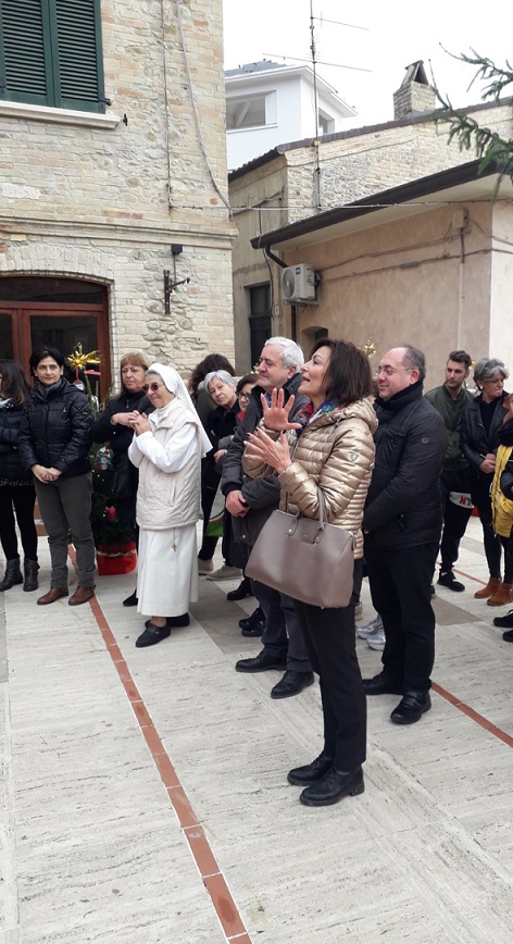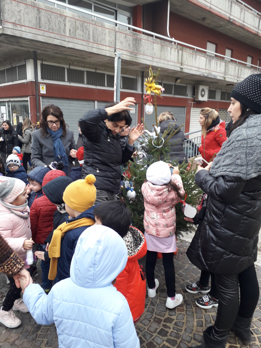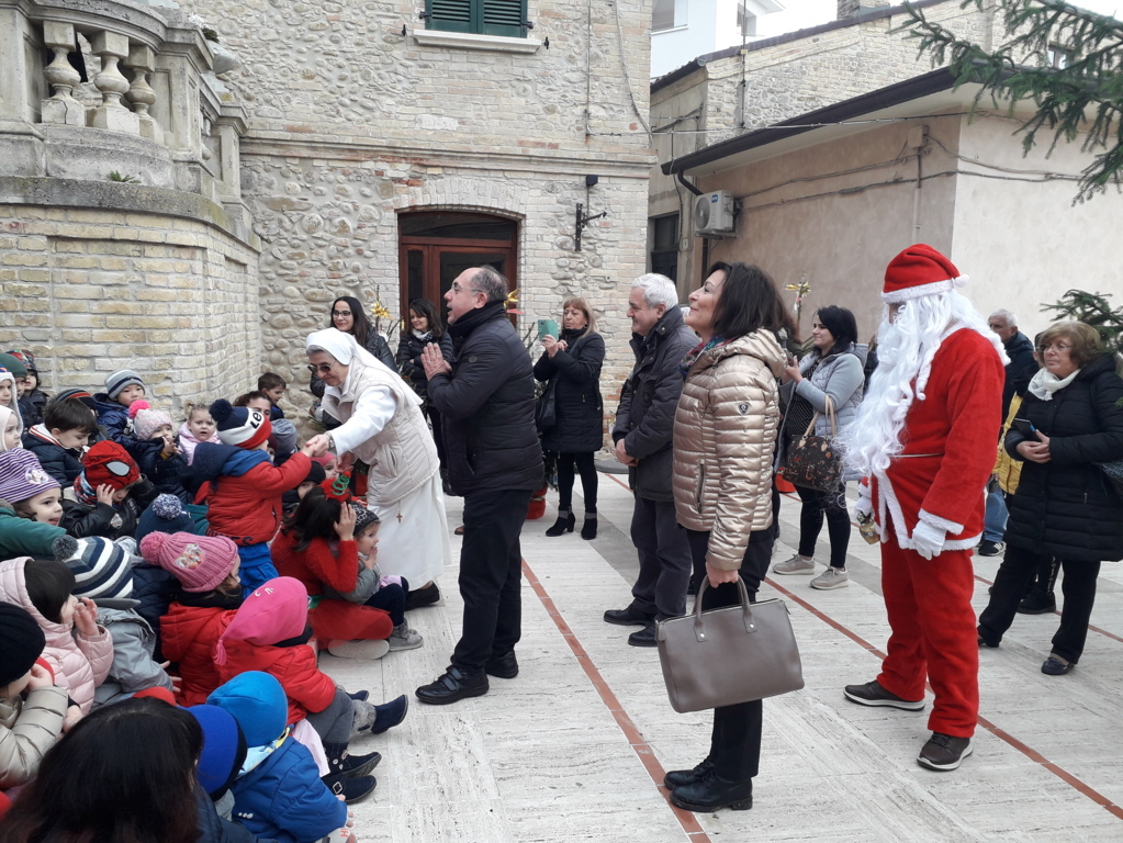 I festeggiamenti si sono aperti stamattina alle ore 9:30, quando gli alunni delle due Scuole dell’Infanzia presenti sul territorio si sono riversati per le vie del paese per addobbare gli abeti presenti all’esterno di ogni esercizio commerciale con decorazioni ed ornamenti realizzati mediante l’utilizzo di materiali riciclati. Il corteo, guidato da Babbo Natale con tre elfi e dalle Maestre, ha percorso tutta via Roma, fino alla scalinata davanti al Municipio. Ad attendere i bambini qui c’erano Suor Modesta Ferri, meglio conosciuta come Suor Bertilla (Dirigente della Scuola dell’Infanzia Maria Immacolata), la Dott.ssa Manuela Divisi (Dirigente della Scuola dell’Infanzia dell’Istituto Comprensivo di cui Colonnella fa parte) e il Sindaco del paese Leandro Pollastrelli. Presente anche il parroco don Dino Straccia che ha dapprima scherzato con i piccoli e poi pregato con loro, ricordando il vero significato di questo tempo, l’attesa paziente ed allo stesso tempo entusiasmante di Gesù. Grande gioia per tutti i bambini che hanno deliziato gli illustri ospiti con due canti natalizi.