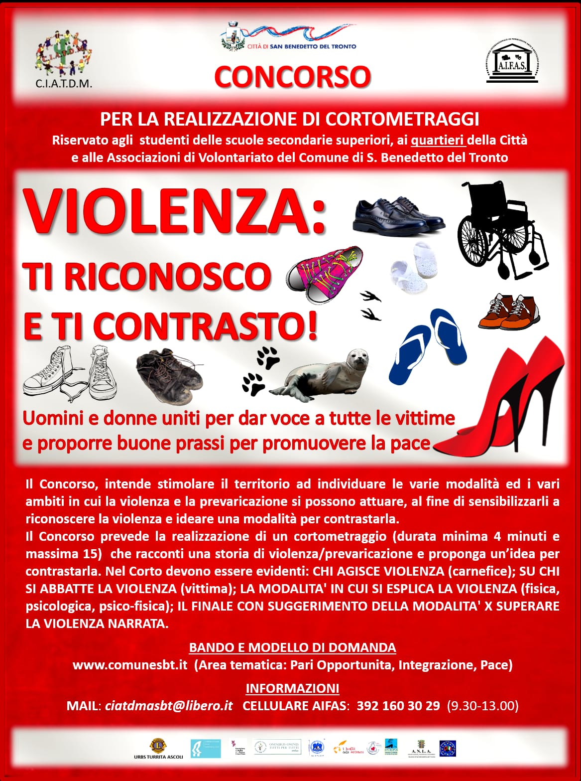 Il concorso prevede la realizzazione di un cortometraggio dal tema: “Violenza: ti riconosco e ti contrasto” , della durata minima di quattro minuti e massimo di quindici, il concorso scade il 25 febbraio. Per maggiori informazioni: mail: ciatdmasbt@libero.it, dalle 9:30 alle 13:00 è a disposizione anche il cellulare AIFAS 3921603029. Il bando e il modello di domanda sono disponibili su: www.comunesbt.it (Area tematica: Pari Opportunità, Integrazione, Pace).