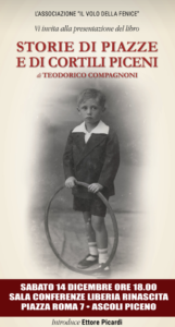 ACQUAVIVA PICENA – Continua la presentazione del nuovo lavoro di Teodorico Compagnoni, “Storie di piazze e di cortili piceni”. Questa volta l’evento si terrà sabato 14 dicembre presso la splendida Sala conferenze della Libreria Rinascita di Ascoli Piceno, in piazza Roma 7 dalle ore 18:00. Un libro affascinante che ha riscosso grandi apprezzamenti e che coinvolge tutto il piceno, inteso come il Piceno storico e cioè quello che comprende le Marche e parte dell’Umbria e dell’Abruzzo, come testimoniano molti reperti. Compagnoni ha raccolto testimonianze che hanno a poco a poco “costruito” questo lavoro; tanti uomini e donne, anche un po’ avanti negli anni, che si sono resi disponibili a raccontare storie, tradizioni, pratiche, usi e costumi ricorrenti in vari periodi dell’anno che abbracciavano il sacro e il profano, tutto ciò andava a scandire la quotidianità della gente picena di qualche decennio fa e che in fondo ha gettato le basi del mondo di oggi. Un appuntamento da non perdere, per saperne di più sulla storia del territorio piceno e per rimembrare felici e cordiali ricordi. Sarà presente all’evento Ettore Picardi, al quale è affidata l’introduzione dell’incontro.