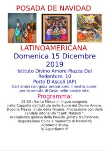 SAN BENEDETTO DEL TRONTO – Anche la comunità Latinoamericana della nostra Diocesi celebra l’avvicinarsi del Natale. Lo fa, in particolare, con la “Posada de Navidad”, prevista per questa domenica, 15 dicembre dalle ore 15.30, presso l’Istituto del Divino Amore di piazza Cristo Re, a Porto d’Ascoli. Si parte con la Santa Messa celebrata in lingua spagnola dal sacerdote messicano Padre Roel, per poi passare alla vera e propria Posada. Ci sarà la tradizionale piñata, insieme a prodotti tipici delle festività natalizie in terra Latinoamericana. La partecipazione è aperta a tutti.