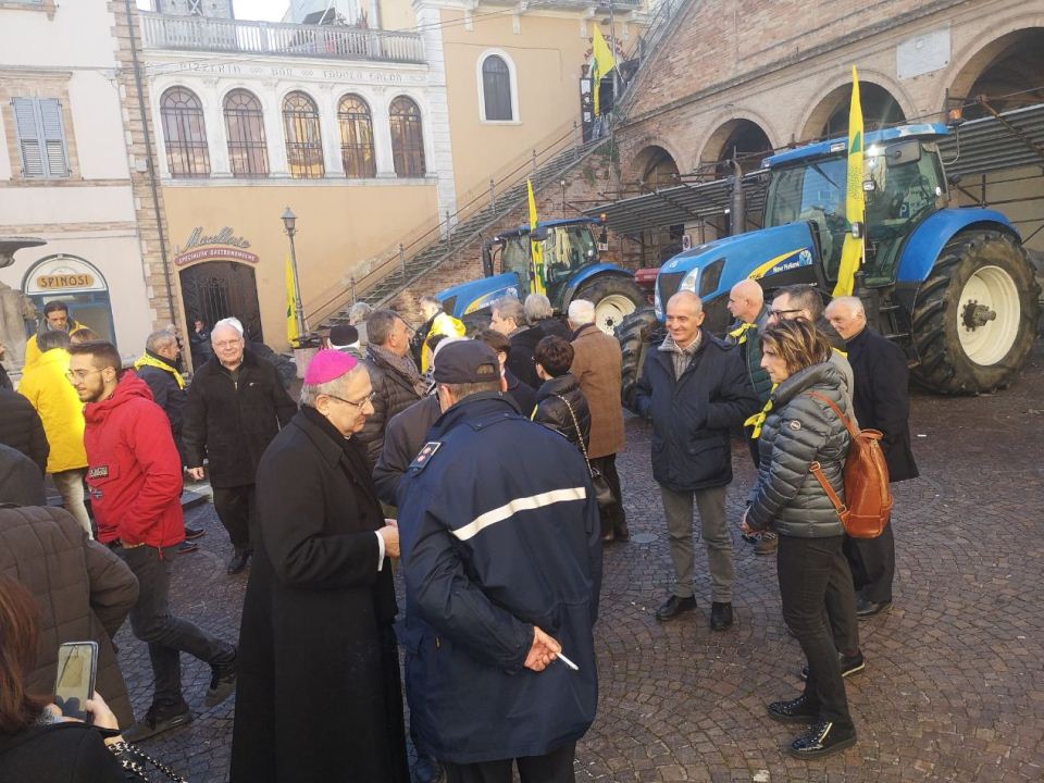 Terminata la funzione, ci si è spostato sulla piazza prospiciente la chiesa, dove il vescovo ha benedetto alcuni trattori, alla presenza del sindaco cuprense, Alessio Piersimoni e dei dirigenti dell’associazione di categoria: il presidente Armando Marconi ed il direttore Alessandro Visotti.