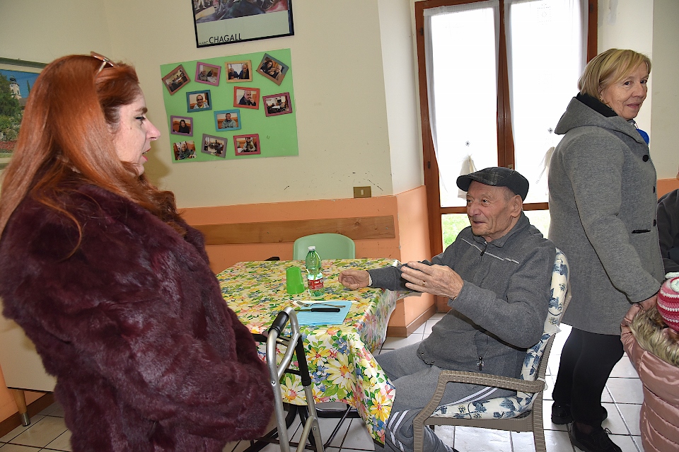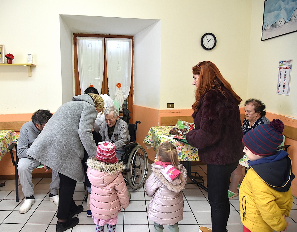 Suscitando la commozione di tutti (ospiti e accompagnatori), essi hanno salutato i “nonni” ospiti portando a ciascuno di loro doni, abbracci e carezze.