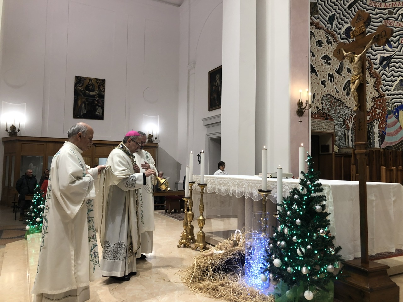 Il Vescovo Carlo e i concelebranti don Patrizio Spina, Vicario Generale della nostra diocesi e parroco della Cattedrale, e don Romualdo, parroco emerito della Cattedrale, hanno fatto il loro ingresso in chiesa mentre il coro ha eseguito il canto Adeste fideles. Giunti davanti all’altare, il Maestro Massimo Malavolta ha intonato il canto della Kalenda, il cui testo è antichissimo e mette in relazione il Mistero dell’Incarnazione con date ed eventi significativi sia per la storia sacra che per quella profana. Terminato il canto, il Vescovo ha “svelato” il bambinello che è stato adorato e incensato.