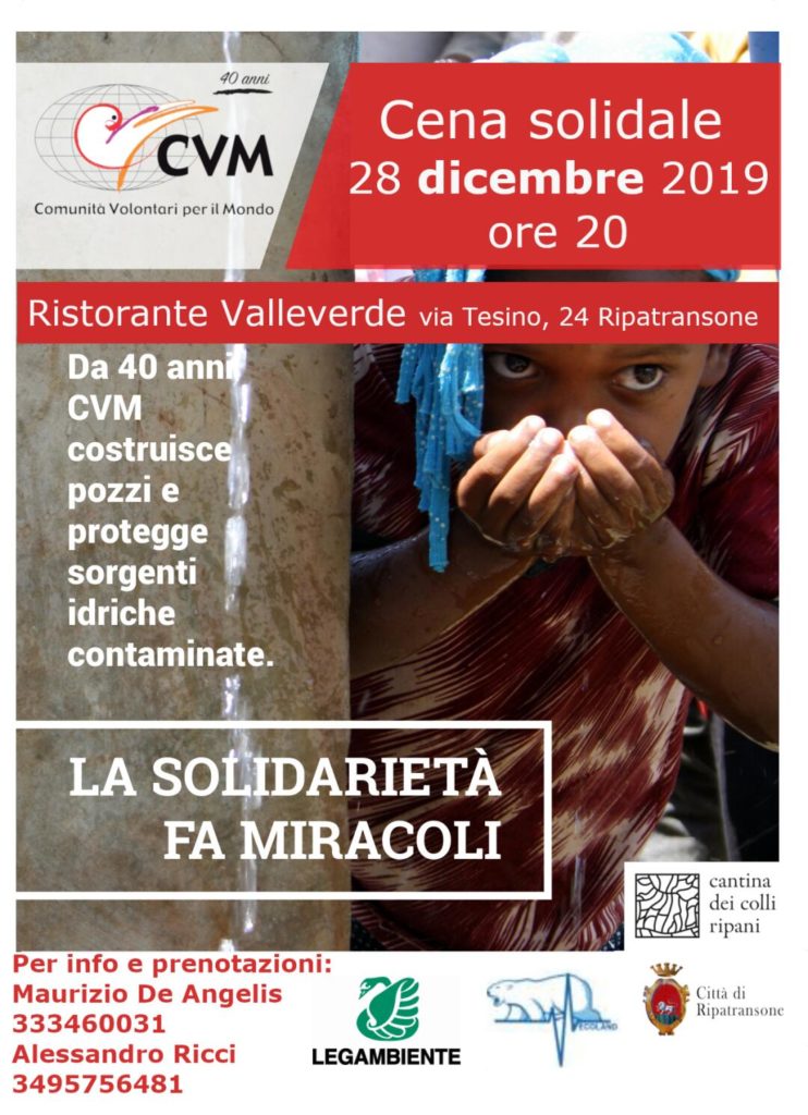 RIPATRANSONE – Si terrà Sabato 28 Dicembre, alle ore 20.00 presso il Ristorante Valle Verde di Ripatransone, la Sedicesima Edizione della Cena Solidale. Nata nel 2004 dalla collaborazione tra il Comune di Ripatransone ed il CVM (Comunità Volontari per il Mondo), l’iniziativa ha l’obiettivo di sostenere progetti in Etiopia riguardanti l’approvvigionamento di acqua pulita, la scolarizzazione, la prevenzione dall’AIDS ed il supporto all’infanzia. L’occasione sarà inoltre utile per rivolgere uno sguardo verso le condizioni di povertà in cui versano le popolazioni dei paesi in via di sviluppo.