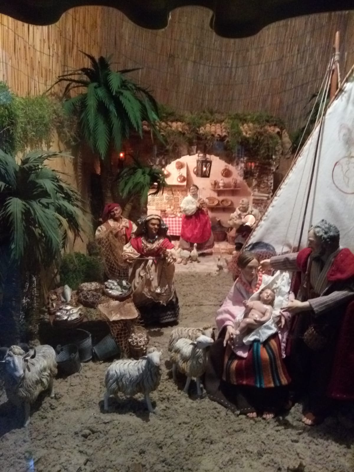 Maria tiene in braccio il bimbo Gesù, nudo e disteso su un bianco lenzuolo, che guarda teneramente Giuseppe. Anche la Vergine indossa uno scialle, un abito variopinto e una bella collana che ravviva il colorito ambrato del suo viso. Accanto a lei le quattro pecore, un pescatore che solleva la rete e la pescivendola sua moglie che ha esposto una curiosa varietà di pesci e molluschi che appaiono vivi e freschissimi; c’è anche un secchio pieni di “bomboletti”: lei è felice e sta pesando i pesci da regalare alla nuova famiglia.