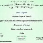Da qualche anno poi, l’impegno fondamentale dei ragazzi  dell’Associazione Giovanile di Volontariato “Il Chiostro” si è affiancato alla storica iniziativa del Baccalà mettendo a disposizione altre specialità (Polenta al sugo di Baccalà, Patate olio e prezzemolo, Arance alle olive nere, dolce) da consumare in appositi siti preparati per l’occasione.