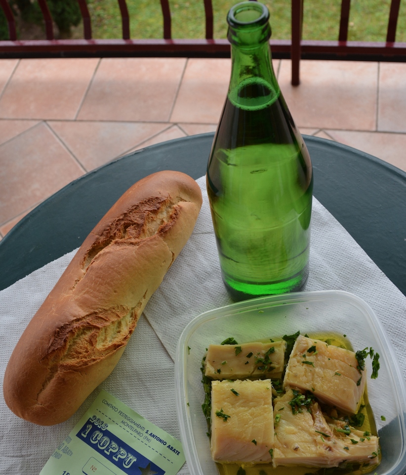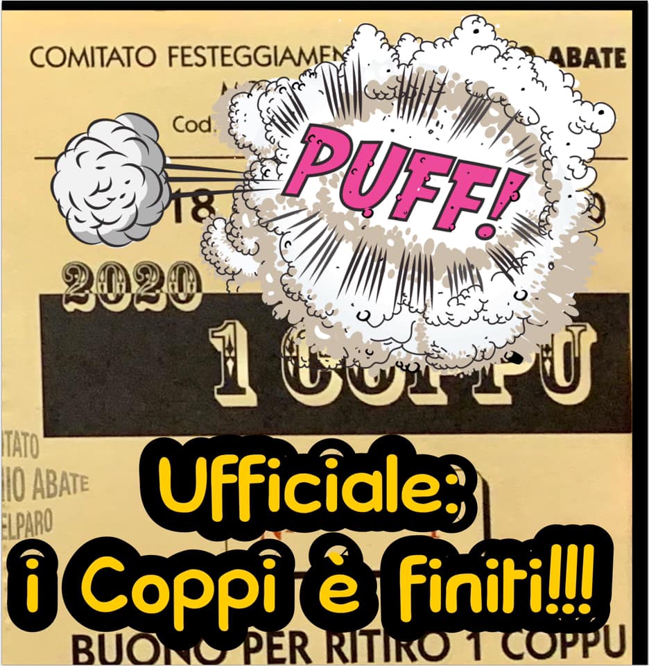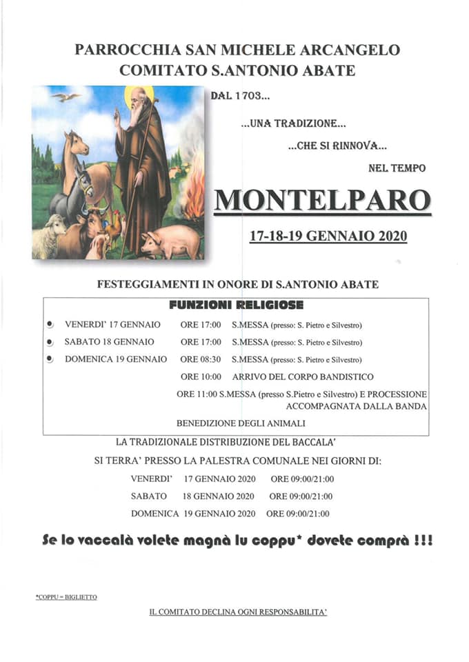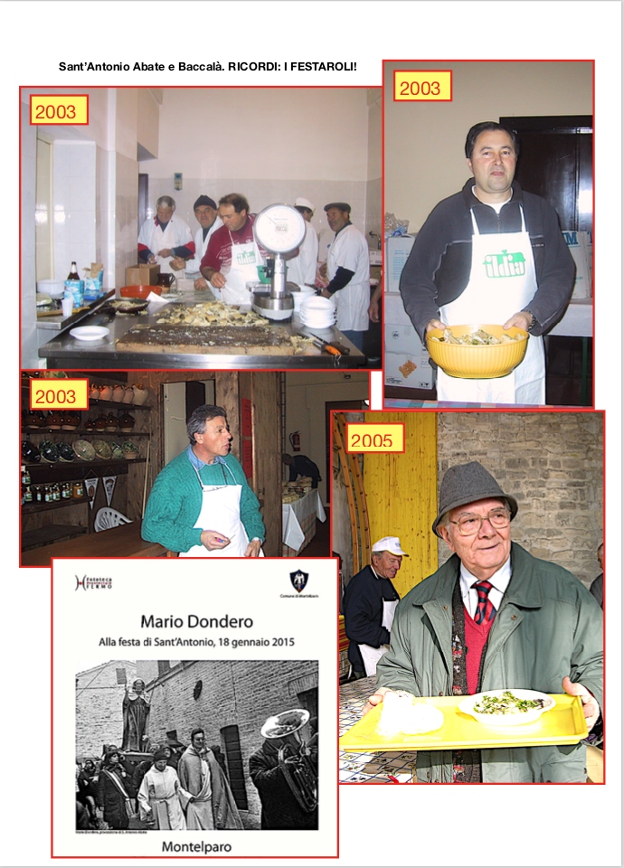Tutto questo sfociò, proprio in occasione della festa di Sant’Antonio Abate, in un lautissimo pranzo a base di baccalà concedendo a ogni intervenuto una porzione che, in base all’unità di misura del tempo, corrispondeva ad UN COPPO (circa 300 grammi)! Il tutto completato da una filetta di pane e da un litro di vino, che da qualche anno viene fatto con uve pregiate e appositamente preparato per l’occasione, dalla rinomata Cantina Montelparese “Casale Vitali”!