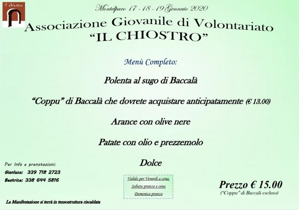 Da qualche anno poi, l’impegno fondamentale dei ragazzi  dell’Associazione Giovanile di Volontariato “Il Chiostro” si è affiancato alla storica iniziativa del Baccalà mettendo a disposizione altre specialità (Polenta al sugo di Baccalà, Patate olio e prezzemolo, Arance alle olive nere, dolce) da consumare in appositi siti preparati per l’occasione.