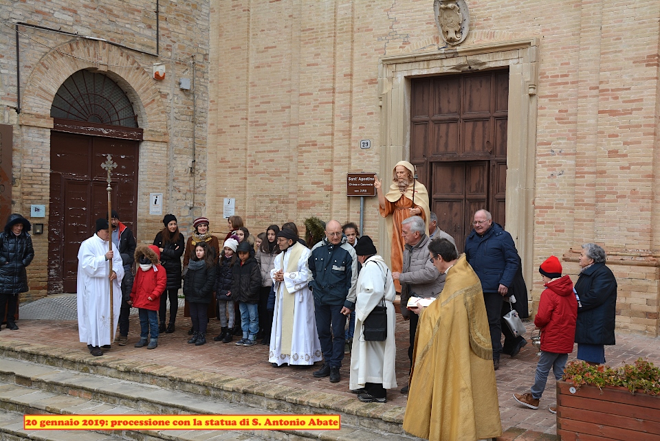 Tutto questo senza trascurare la parte religiosa che vedrà, al termine della Santa Messa, la statua del Santo Antonio Abate (quella recente perché quella storica, in carta pesta, è oramai rigidamente conservata negli interni della chiesa!) portata in processione (sulle spalle dei componenti del Comitato) per le vie del paese. Non potrà infine mancare la benedizione degli animali di cui il Santo è il protettore!