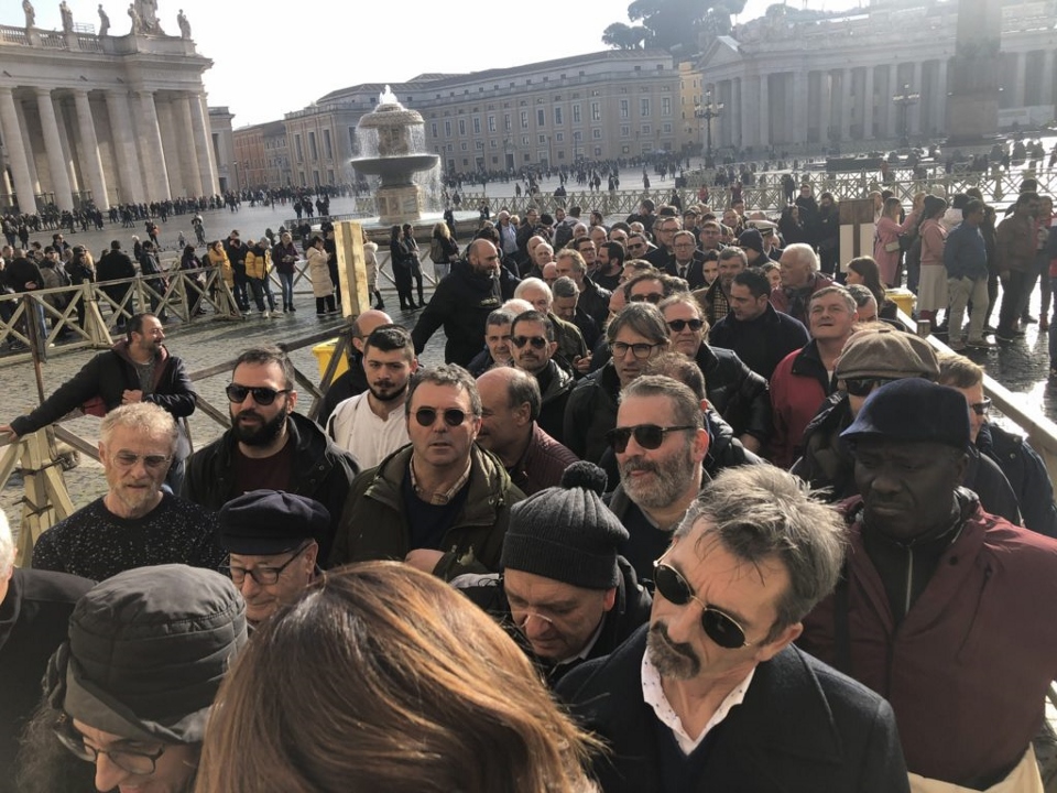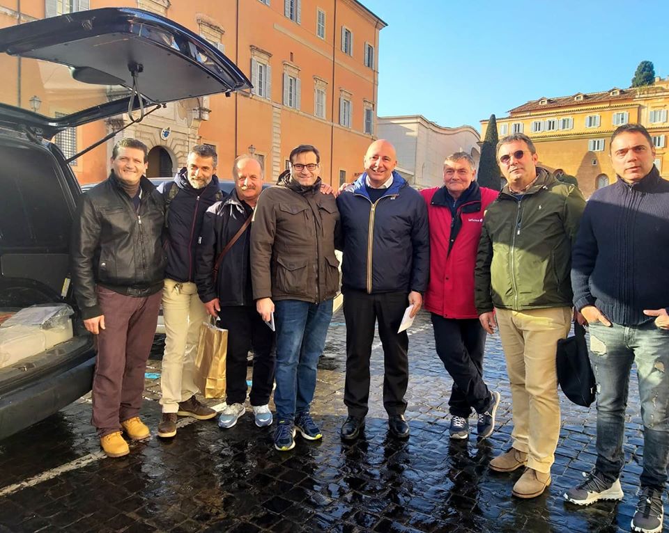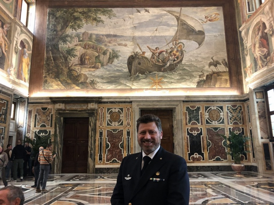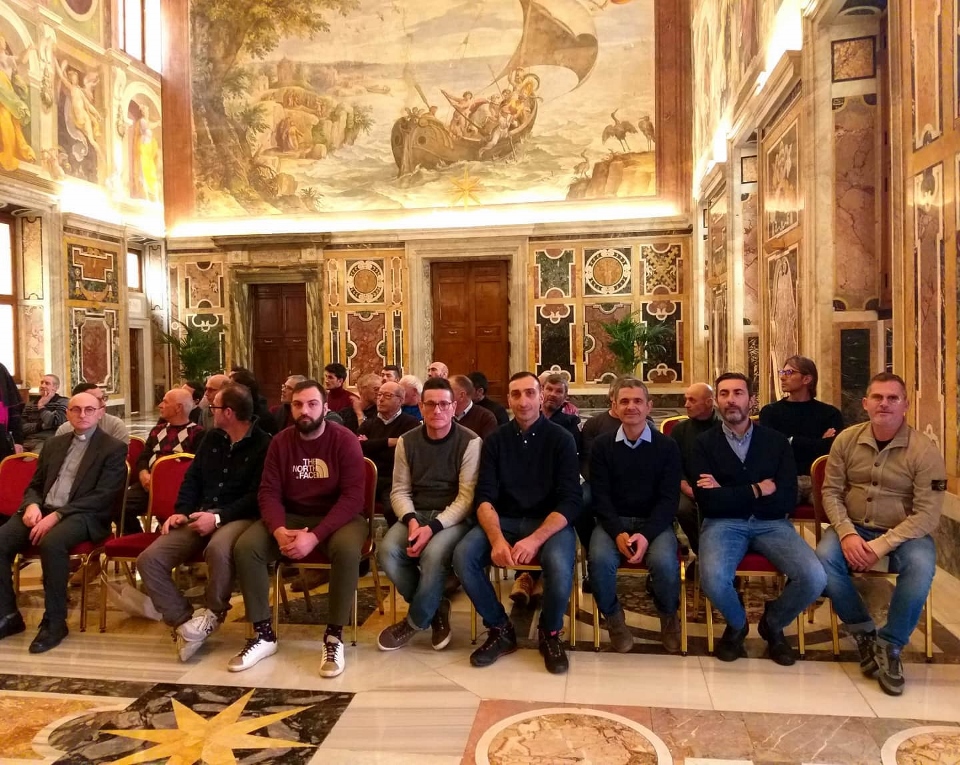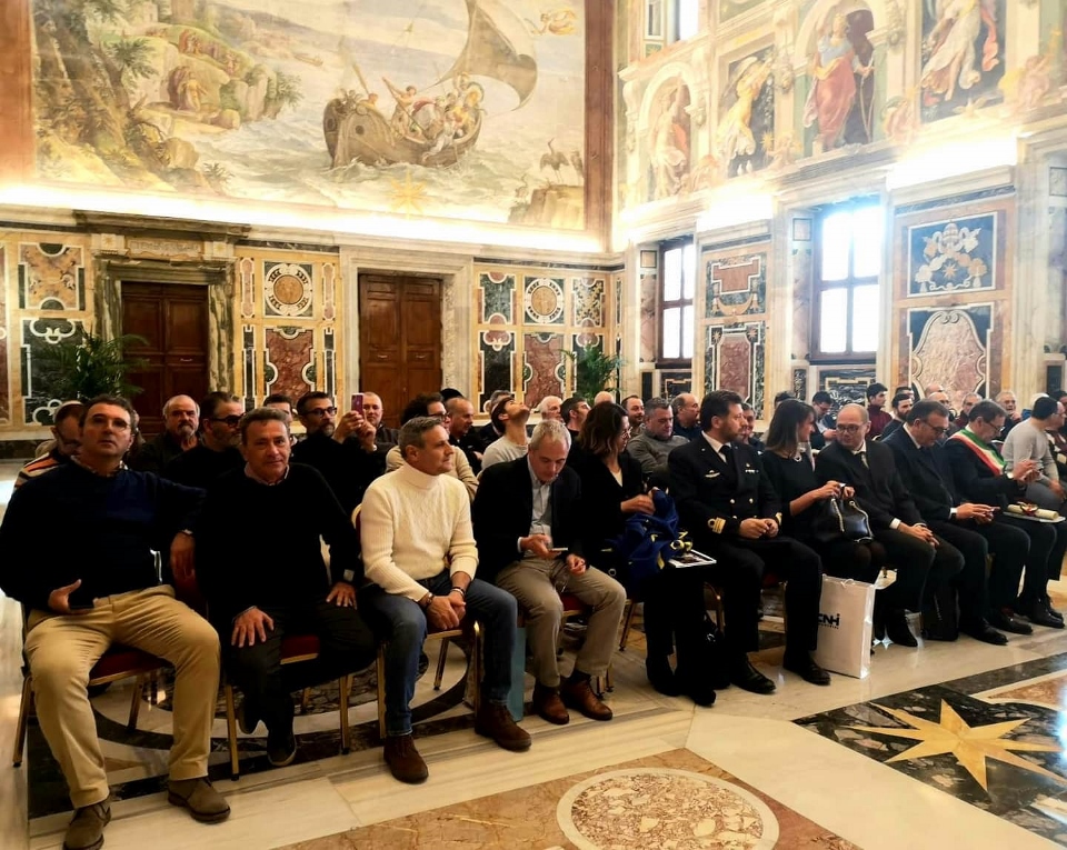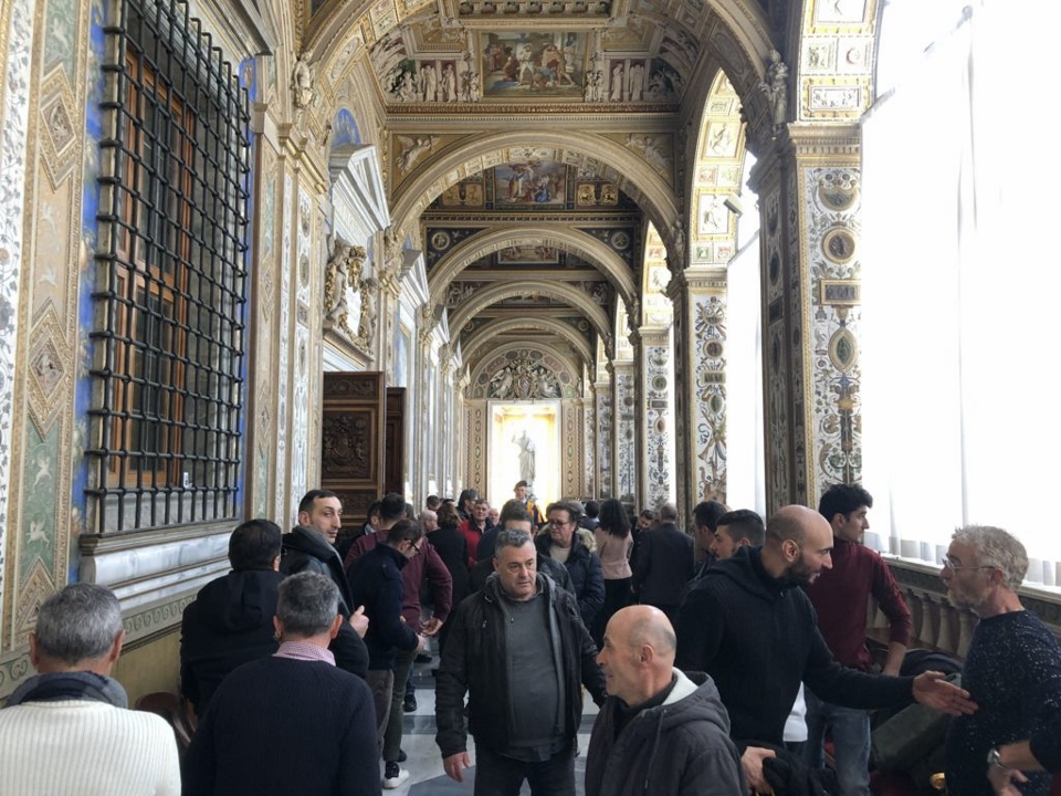 Raggiunta la Città Eterna, il gruppo si è diretto verso la Città del Vaticano, dove, dopo i controlli di rito e l’attesa davanti al Portone di Bronzo, è stato introdotto da una Guardia Svizzera nel Palazzo Apostolico. Durante il tragitto i pescatori non hanno potuto fare a meno di stare col naso all’insù per ammirare stucchi e affreschi, ma lo stupore è divenuto massimo quando sono entrati nella Sala Clementina.