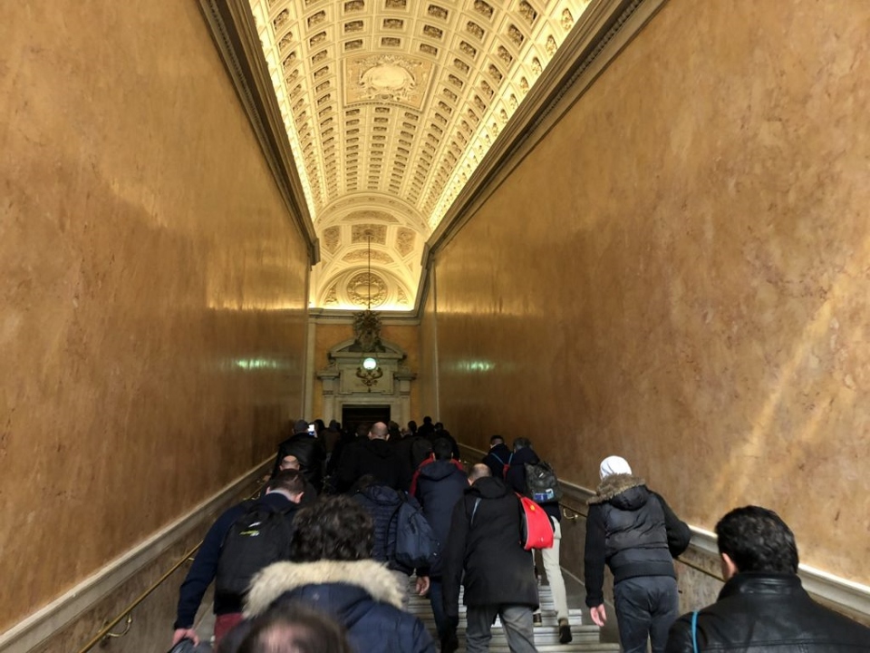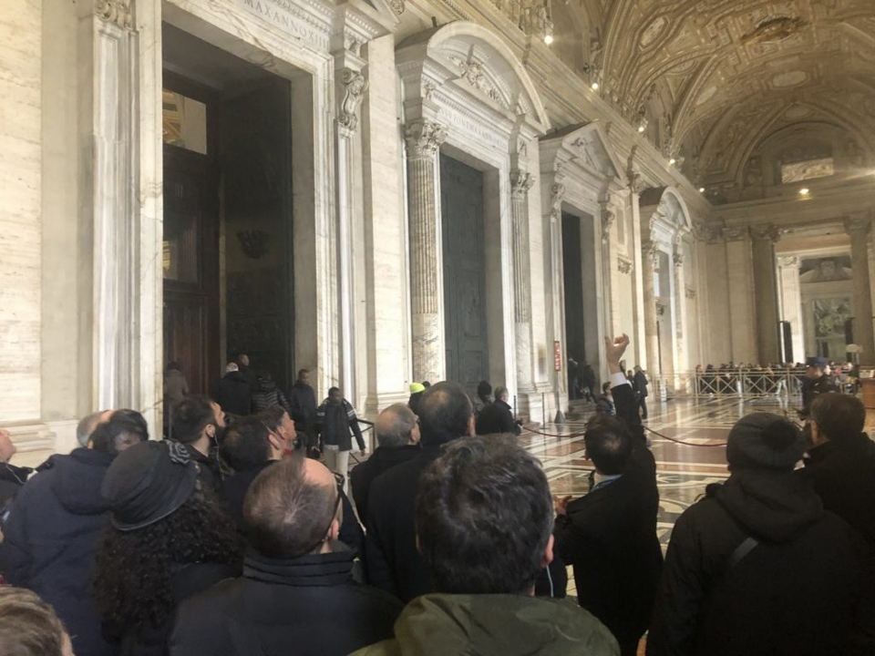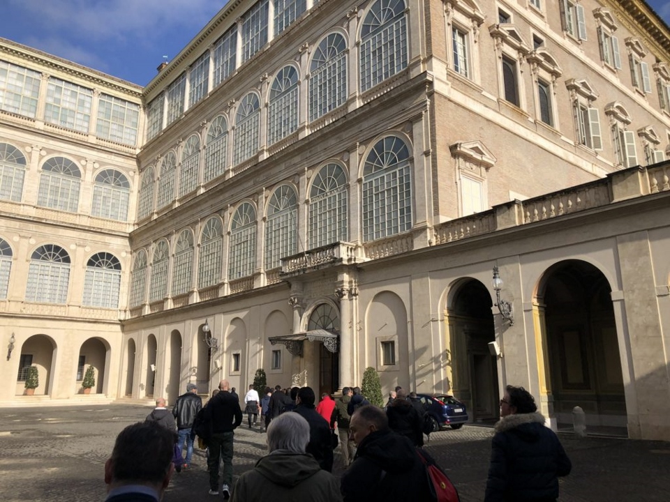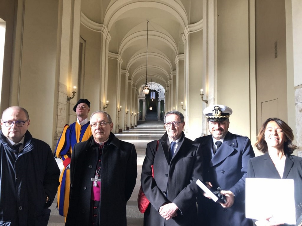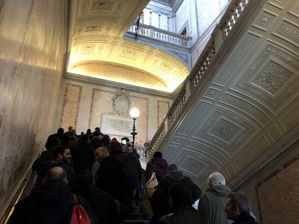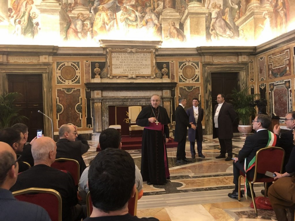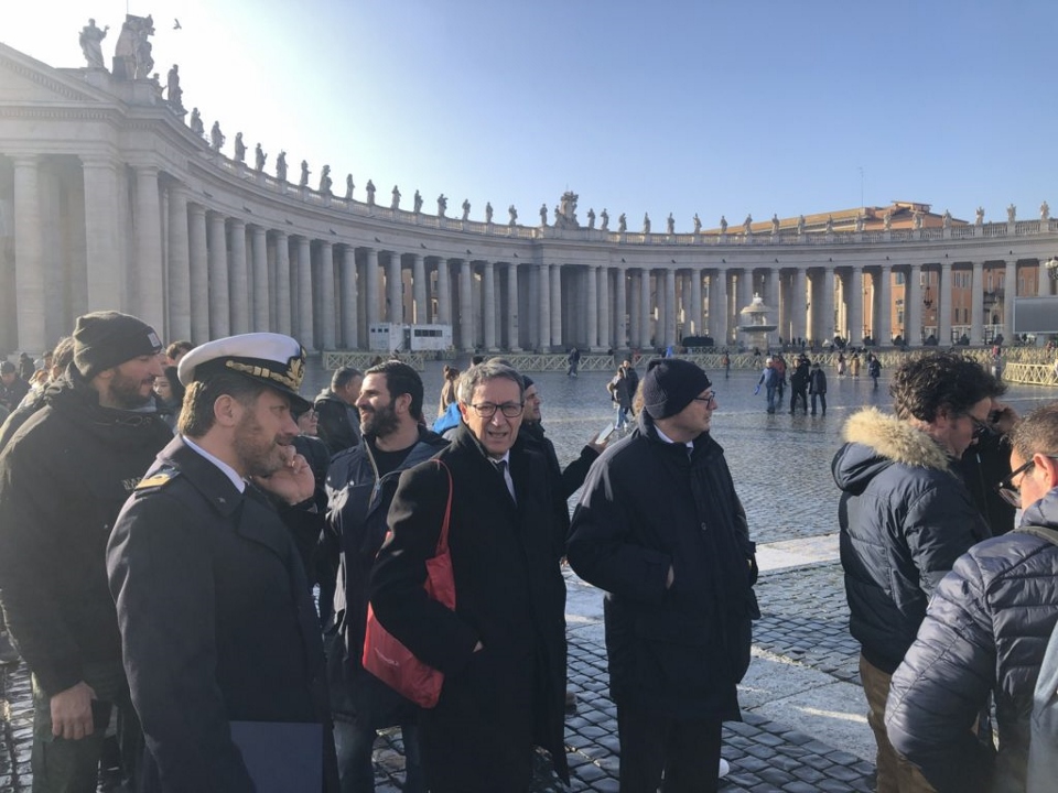 Raggiunta la Città Eterna, il gruppo si è diretto verso la Città del Vaticano, dove, dopo i controlli di rito e l’attesa davanti al Portone di Bronzo, è stato introdotto da una Guardia Svizzera nel Palazzo Apostolico. Durante il tragitto i pescatori non hanno potuto fare a meno di stare col naso all’insù per ammirare stucchi e affreschi, ma lo stupore è divenuto massimo quando sono entrati nella Sala Clementina.