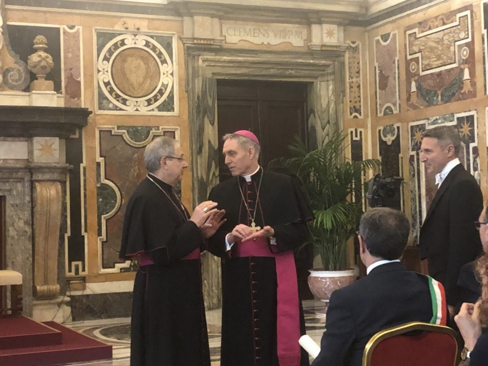 Il Santo Padre è entrato nella Sala Clementina alle 12.30, accompagnato da Mons. Georg Gänswein, Prefetto della Casa Pontificia e Segretario Particolare del Papa Emerito Benedetto XVI, e da un cerimoniere.