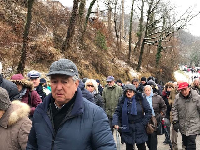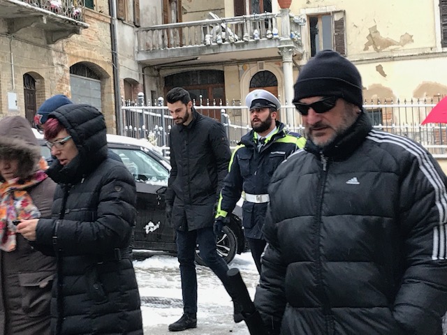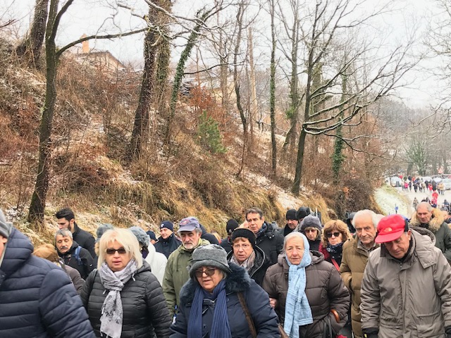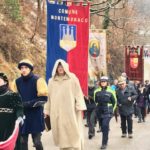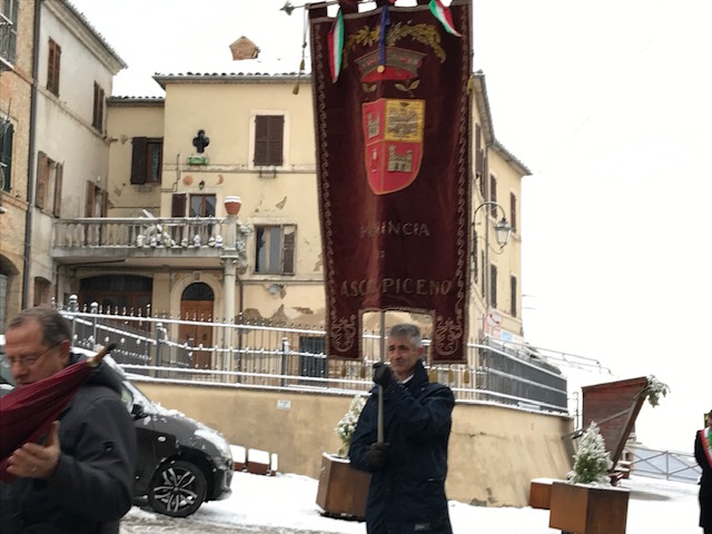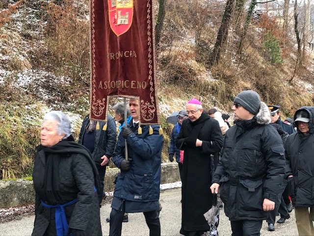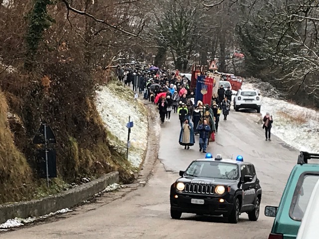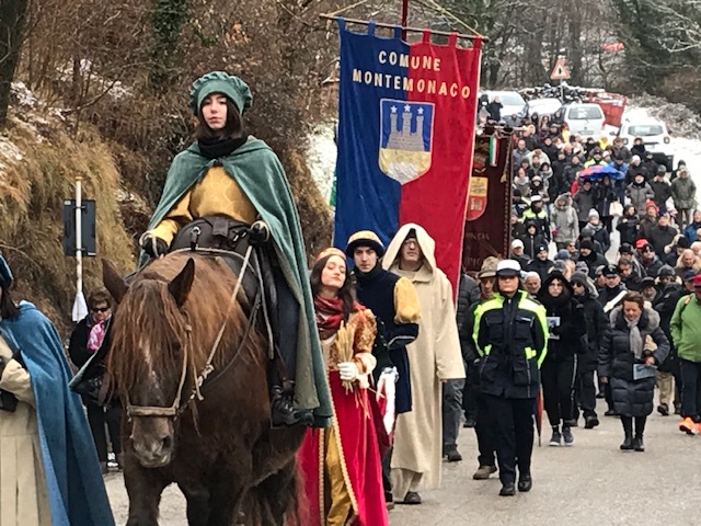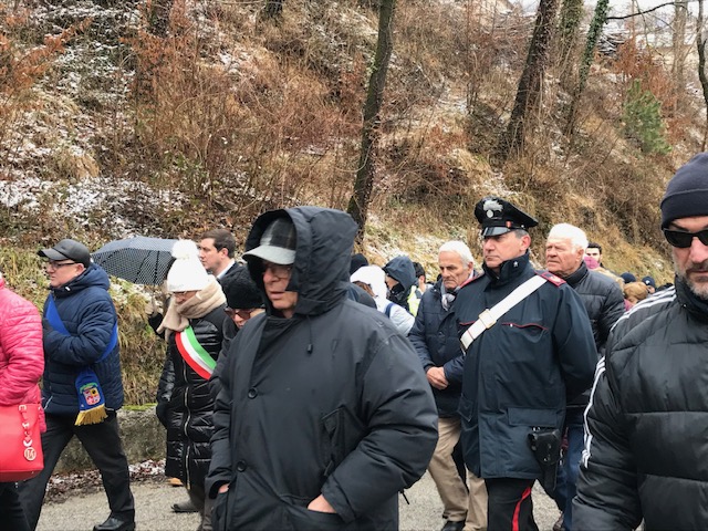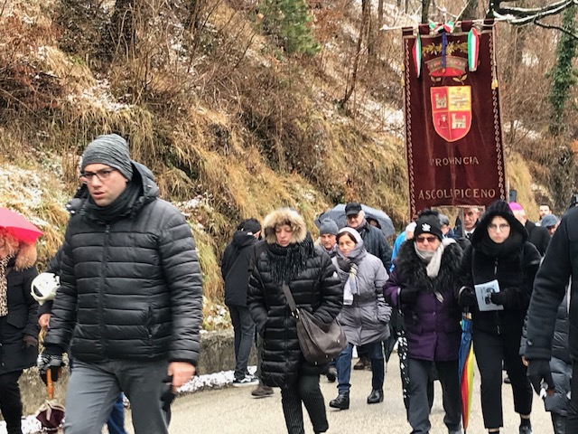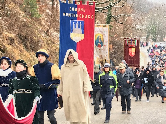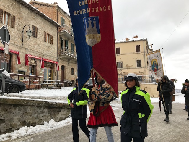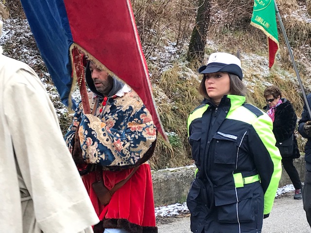 MONTEMONACO – La tempra della gente di Montemonaco non si è smentita nel rinnovato appuntamento in onore di San Sebastiano. In tantissimi oggi, 20 gennaio, hanno sfilato dalla piazza del paese fino alla chiesa di Santa Maria in Casilicchio, nella frazione Tofe, in barba ai 4 chilometri percorsi a piedi e alle temperature al di sotto dello zero. In testa al corteo, accanto ai gonfaloni del Comune e della Provincia di Ascoli, c’erano il sindaco Francesca Grilli, il presidente della Provincia Sergio Fabiani, il presidente del Bim Tronto Luigi Contisiciani e diversi rappresentanti istituzionali e delle forze dell’ordine dei paesi limitrofi, tra cui Michele Franchi vicesindaco di Arquata. Insieme con loro, i Vigili Urbani di Montemonaco e dintorni, tra le prime file o mischiati tra i devoti. Perché San Sebastiano non è solo il Santo che protegge le comunità dalle disgrazie, è anche il protettore della Polizia Municipale. Questa tradizione a Montemonaco affonda le radici nel 1600, quando gli abitanti andarono per la prima volta in pellegrinaggio dal paese fino alla chiesa di Tofe, per ringraziare San Sebastiano di averli protetti dalla peste. Da allora non ci sono stati venti, pioggia, nevone e neppure terremoti ad impedire una festa rimasta nel tempo molto cara ai montemonachesi.