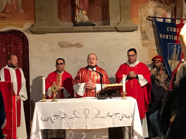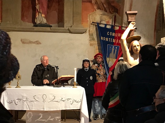 La processione è terminata nella chiesa di Santa Maria in Casilicchio dove il vescovo della Diocesi di San Benedetto, monsignor Carlo Bresciani, ha celebrato la messa insieme a don Luca Rammella, parroco di Montemonaco, ed altri sacerdoti. Parole come speranza, che non deve mai venire meno, e fiducia nel seguire la volontà dei Signore si sono alternate nell’omelia dell’alto prelato, risuonando come un forte incoraggiamento alla popolazione a non darsi per vinta di fronte alle mille difficoltà, di ogni giorno o epocali come quella del sisma 2016. «Nella nostra vita ci sono tanti momenti difficili – ha detto monsignor Bresciani -. Chi ci dà la forza di affrontarli? Certamente Dio, perché è sua l’ultima parola, come dice l’apostolo San Paolo. E come testimonia la vita dei martiri. Quella di San Sebastiano che ha saputo mantenere fede alla parola data anche a costo del martirio, appellandosi al fatto che Dio gli avrebbe dato la ricompensa. Ma per noi, cosa significa tutto questo? Vuole dire che Lui sarà il nostro difensore e non ci abbandonerà nei momenti in cui ci sentiamo impotenti. E che, forti di tale convinzione, guardiamo la vita con estrema fiducia. In che modo? Quando noi non possiamo fare nulla davanti al male, possiamo sempre donare il nostro amore.