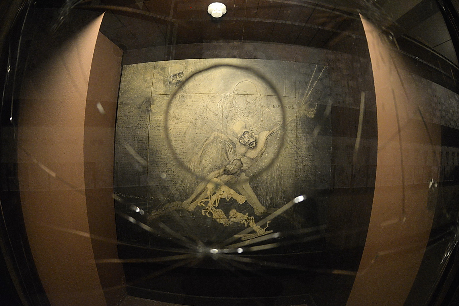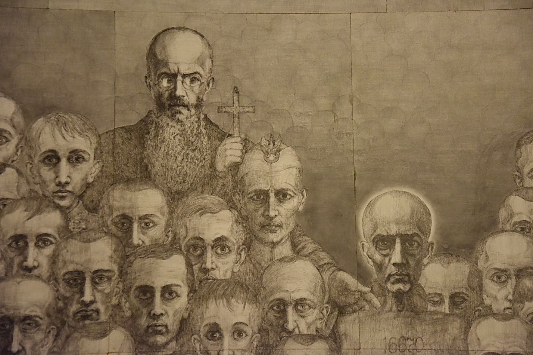 “Questa non è una mostra, questa non è arte, sono delle parole racchiuse nel disegno. Vi prego leggete queste parole che io per 50 anni non potevo dire”, le parole vergate dallo stesso artista, che rappresentano il rifiuto di accostare l’arte ad una cosa terribile come il racconto di un periodo drammatico come quello vissuto dai prigionieri nei campi di sterminio. Un’apocalisse creata dagli uomini che viene spiegata in diverse tavole sulle quali spicca il passo di San Giovanni evangelista “Ecco io vidi una grande folla che nessuno poteva contare, di ogni popolo, lingua e nazione”, dove la porta dell’inferno è vergata dalla scritta “Arbeit macht frei” e, nella moltitudine di corpi tutti uguali ammassati uno sull’altro, come capitava nel campo dove anche per dormire non si poteva scegliere una posizione diversa da quella degli altri, spicca la figura di padre Massimiliano Kolbe, numero 16670, conosciuto da Kołodziej proprio in occasione del sacrificio della sua vita per salvare quella di Francesco Gajowniczek. Lo sporco, la fame, il dolore, il freddo, la sofferenza, la morte ma anche l’amicizia e la solidarietà, tutto questo nelle opere dell’artista che non nasconde l’intenzione di restare uomo in quel campo che voleva trasformarlo, facendogli chiedere ogni giorno“dov’è Dio?”.