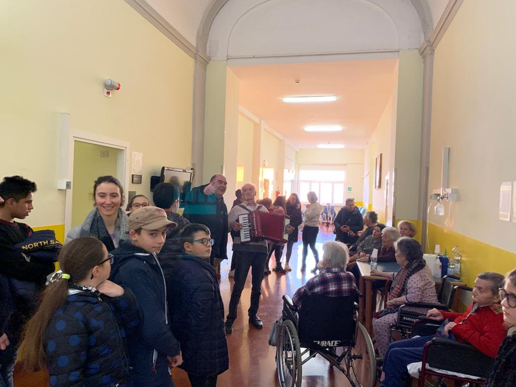 Il racconto dei ragazzi: “Alcuni anziani stanno abbastanza bene e così li abbiamo potuti incontrare in corridoio, dove abbiamo passato un po’ di tempo insieme, cantando, ballando e raccontandoci qualche storia. Altri invece non si sono potuti alzare dal letto, così siamo andati noi a trovarli nelle loro stanze! Carovana al completo con tanto di fisarmonica”, “Molti di loro non smettevano di sorriderci e farci ridere con i loro aneddoti…siamo stati felici di avergli fatto passare un pomeriggio diverso e portato un po’ di scompiglio”.
