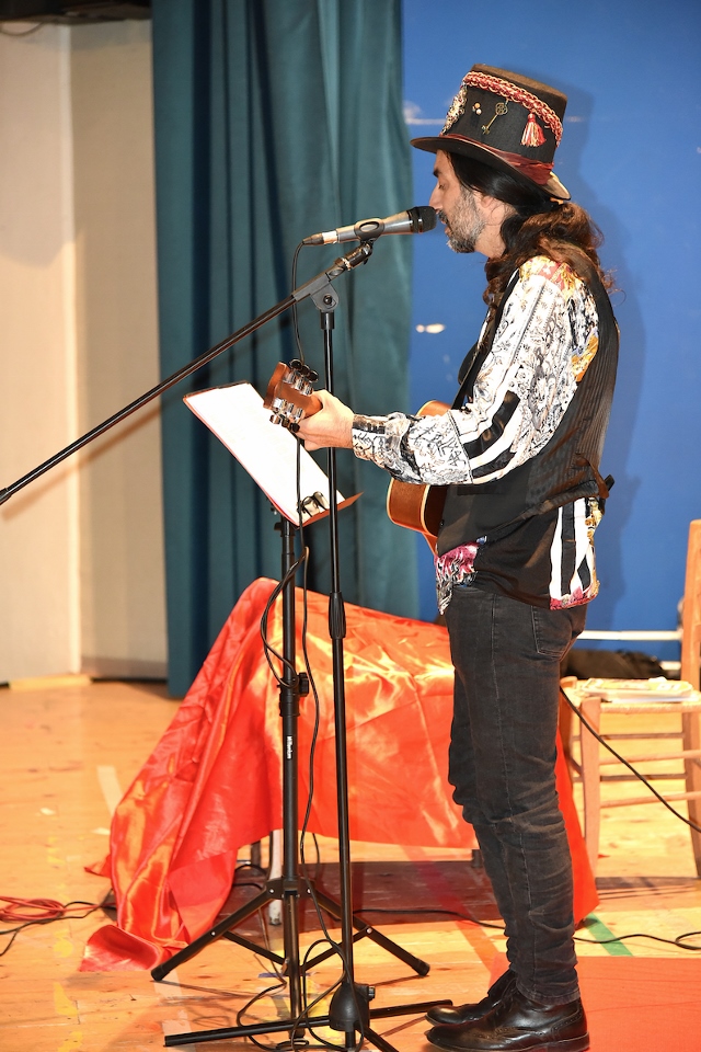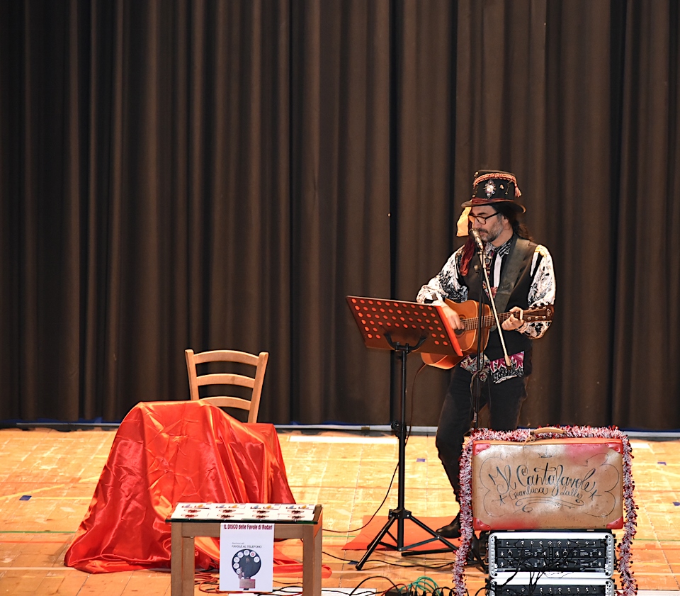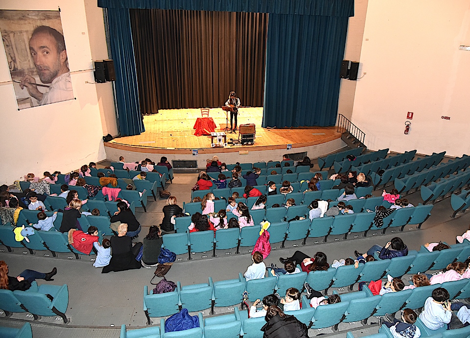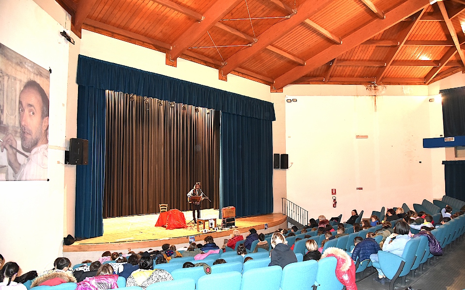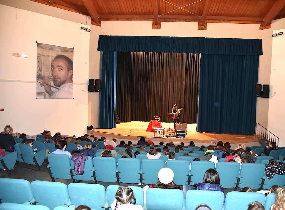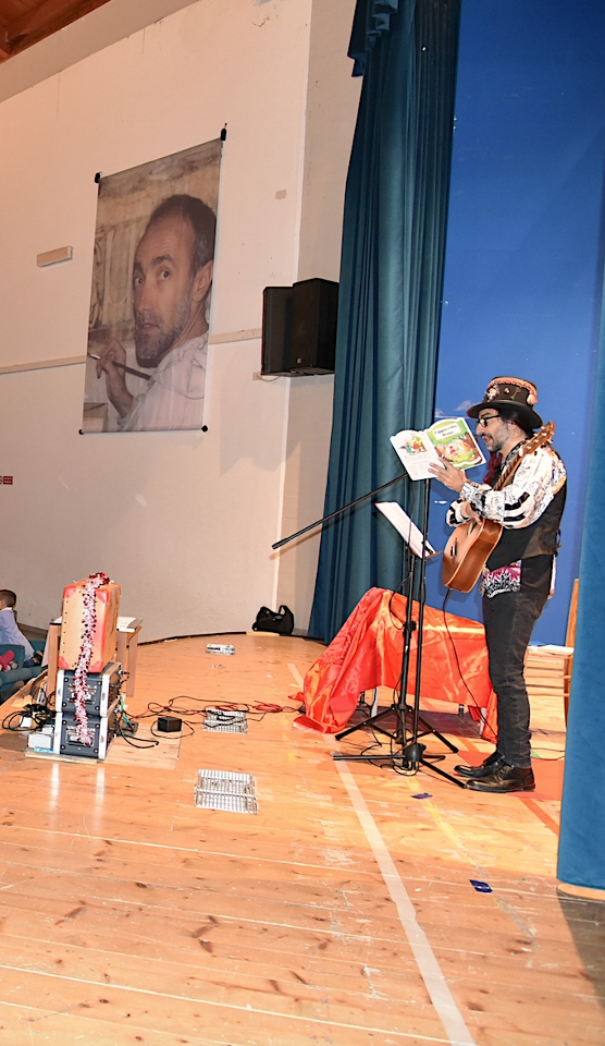 Momenti di grande presa per i piccoli spettatori nell’ascoltare questo grande artista suonare e cantare le favole di Gianni Rodari! Il cantautore ha chiesto collaborazione alle docenti per la lettura di alcune fiabe: tra di esse è salita in palcoscenico anche Daniela Litta (ma è stato coinvolto addirittura il nostro corrispondente e fotografo che, tra l’ilarità dei bimbi che oramai lo conoscono bene, si è cimentato con “Il paese dei Bugiardi” e con “ “Il topo che mangiava i gatti”!).