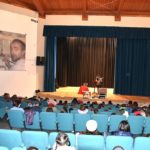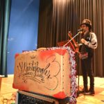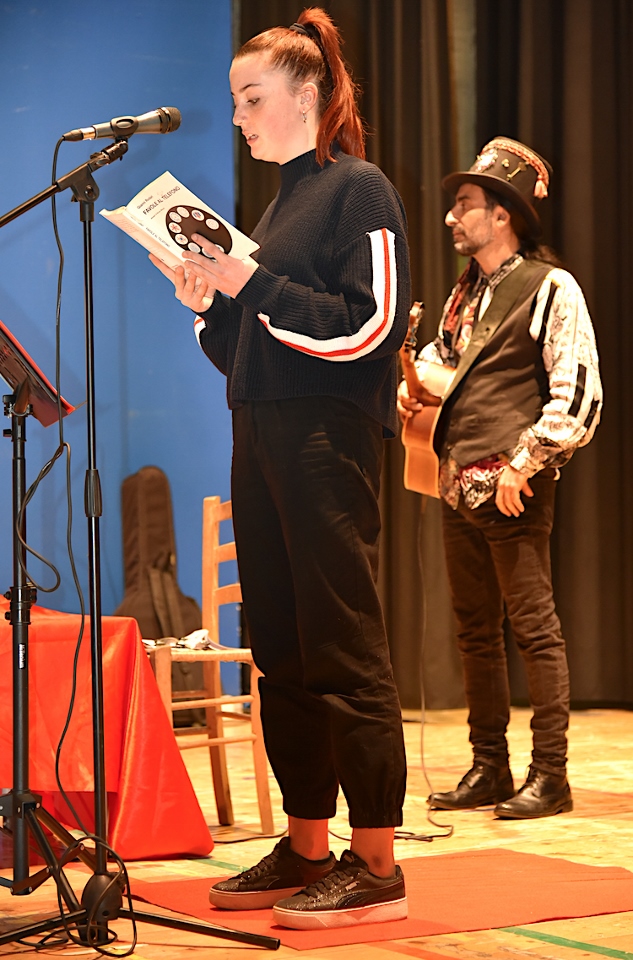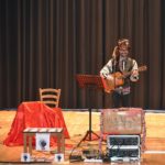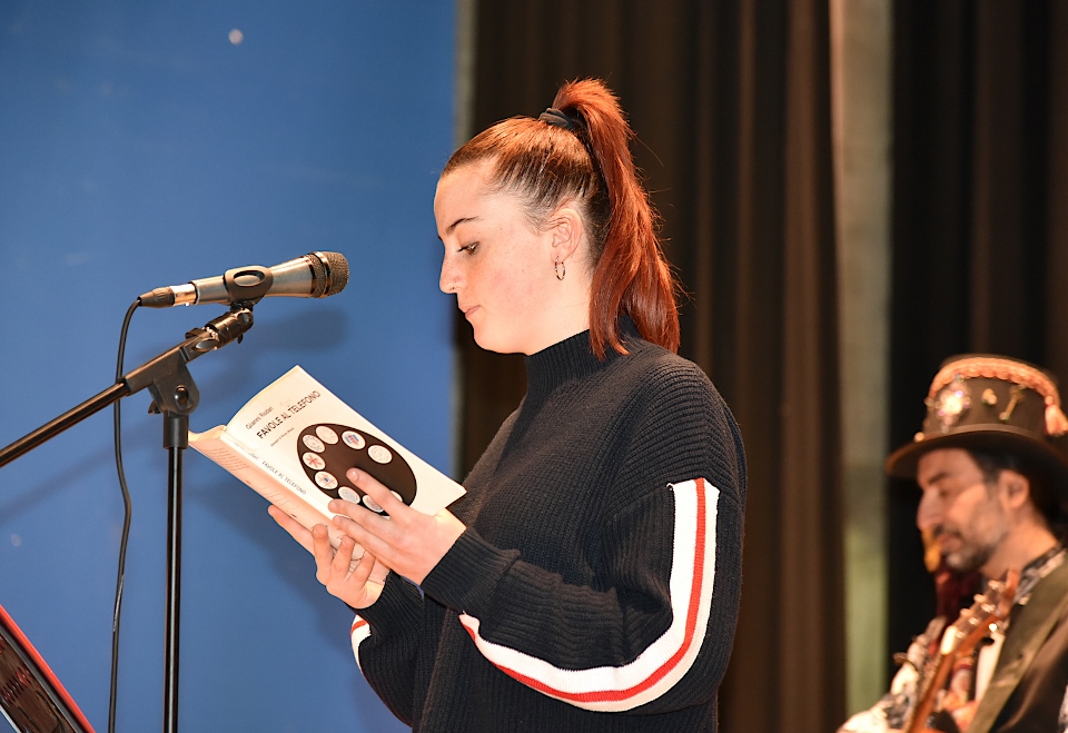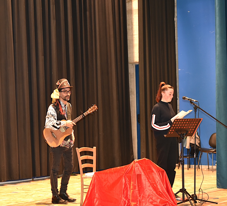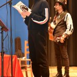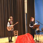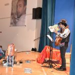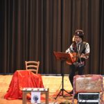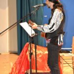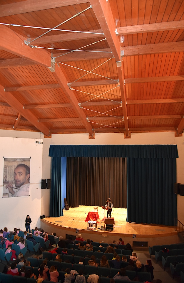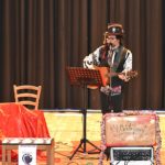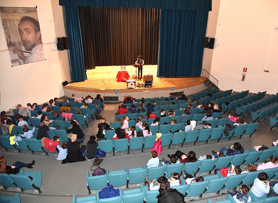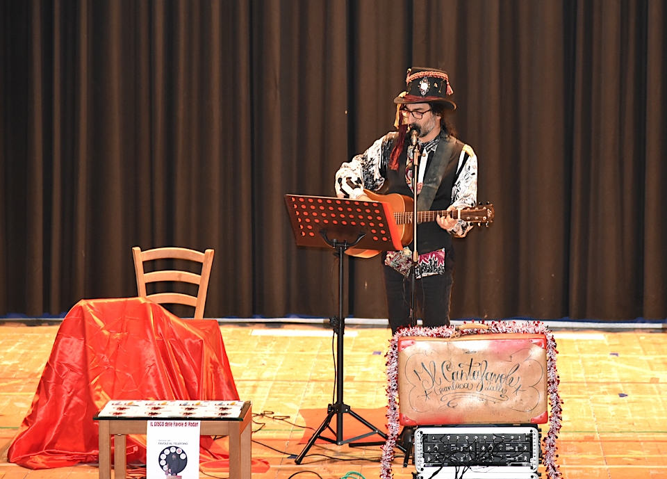 Momenti di grande presa per i piccoli spettatori nell’ascoltare questo grande artista suonare e cantare le favole di Gianni Rodari! Il cantautore ha chiesto collaborazione alle docenti per la lettura di alcune fiabe: tra di esse è salita in palcoscenico anche Daniela Litta (ma è stato coinvolto addirittura il nostro corrispondente e fotografo che, tra l’ilarità dei bimbi che oramai lo conoscono bene, si è cimentato con “Il paese dei Bugiardi” e con “ “Il topo che mangiava i gatti”!).