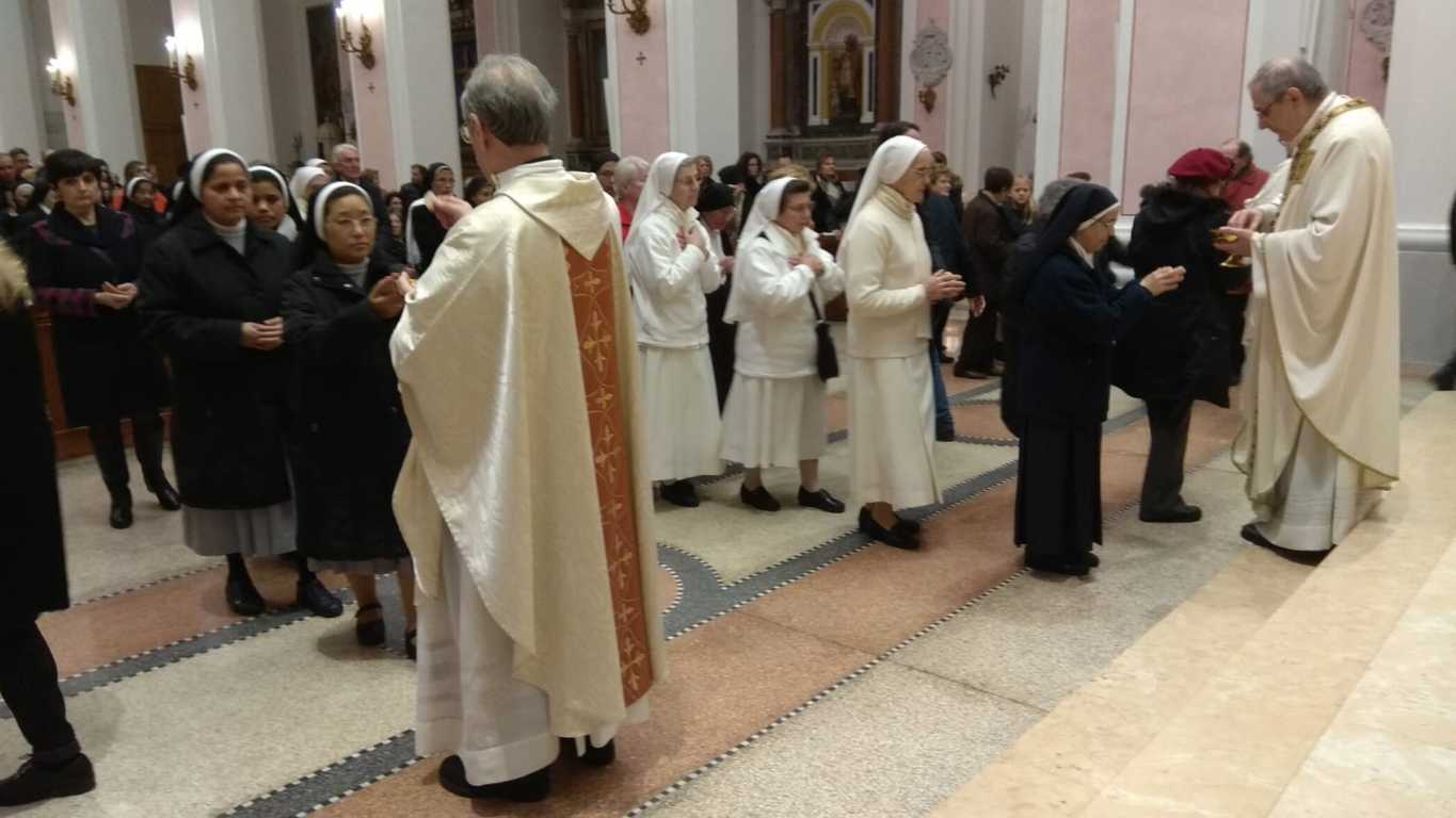 Durante l’omelia, il Vescovo Carlo Bresciani ha spiegato come la Parola di Dio di ieri sia stata particolarmente significativa per le ricorrenze della giornata: “Maria e Giuseppe sono un grande esempio per tutti noi. Essi hanno accolto una vita inaspettata, non programmata. E non si sono limitati ad accoglierla, a tutelarla e a conservarla, bensì, con la presentazione di Gesù al tempio, l’hanno indirizzata a Colui che è la causa e lo scopo di ogni nostra azione: Dio. Maria e Giuseppe hanno riconosciuto di non essere il tutto della vita di Gesù, anzi hanno compreso che la pienezza della vita deve essere ricercata in Dio. Questo dunque ci hanno insegnato: non basta accogliere la vita e custodirla, occorre che essa trovi il vero motivo per essere vissuta, perchè è solo in un preciso momento che la nostra vita trova il suo compimento, nell’incontro con Dio. Finchè non apriamo le porte a Dio, non apriamo le porte alla vita. Più oscuriamo Dio, più rinunciamo alla vita. Tante cose possono contribuire a vivere bene (il benessere fisico, il denaro), ma da soli non sono sufficienti a dare un senso alla nostra vita e a quella dei nostri figli: è solo l’Amore di Dio che spinge il mondo, che regge la vita. Questo vale per ciascun essere umano ed in particolare per chi ha consacrato la propria vita a Dio. Se non capiamo questo, non capiamo il senso della vita e ancor meno capiamo il senso della vita consacrata.”