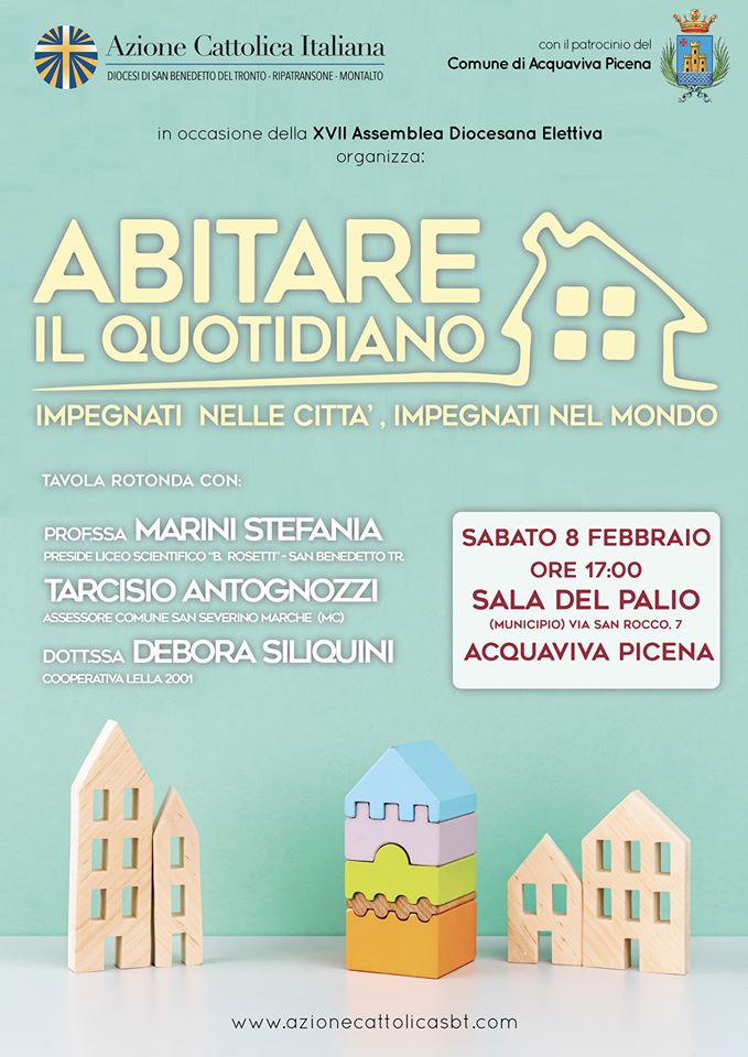 Invece oggi, sabato 8 febbraio, alla vigilia della XVII assemblea diocesana, l’Azione Cattolica organizza un momento di confronto pubblico presso la Sala del Palio di Acquaviva Picena (via San Rocco 7, presso il Municipio cittadino)